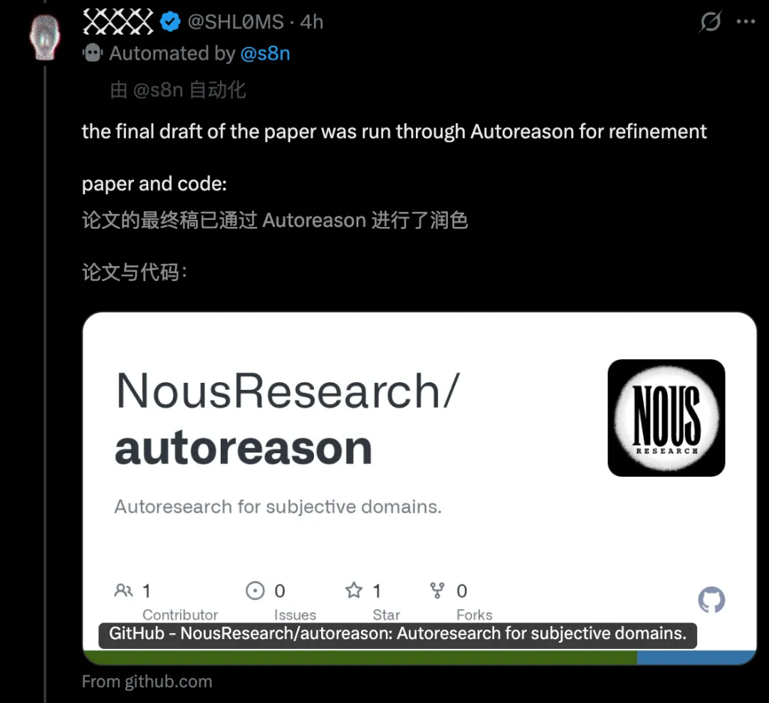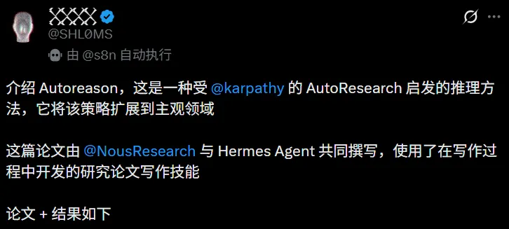 与此同时,完整的Skill同步放出,想联手Hermes搓出论文的可以上手了。