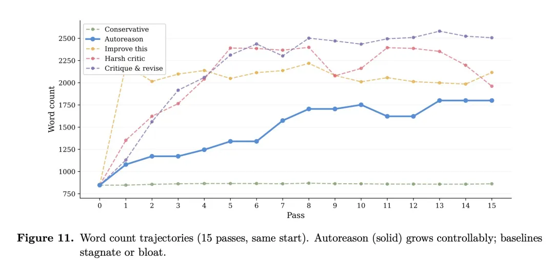 而Autoreason的输出却每次都在增长,因为它的裁判机制直接拦截了任何「越改越烂」的情况。