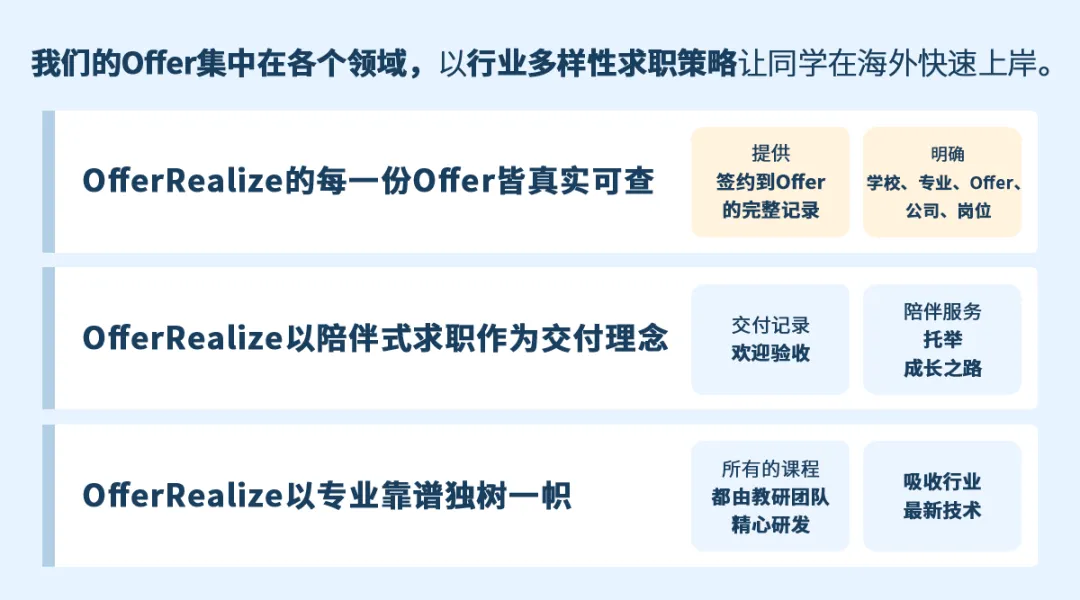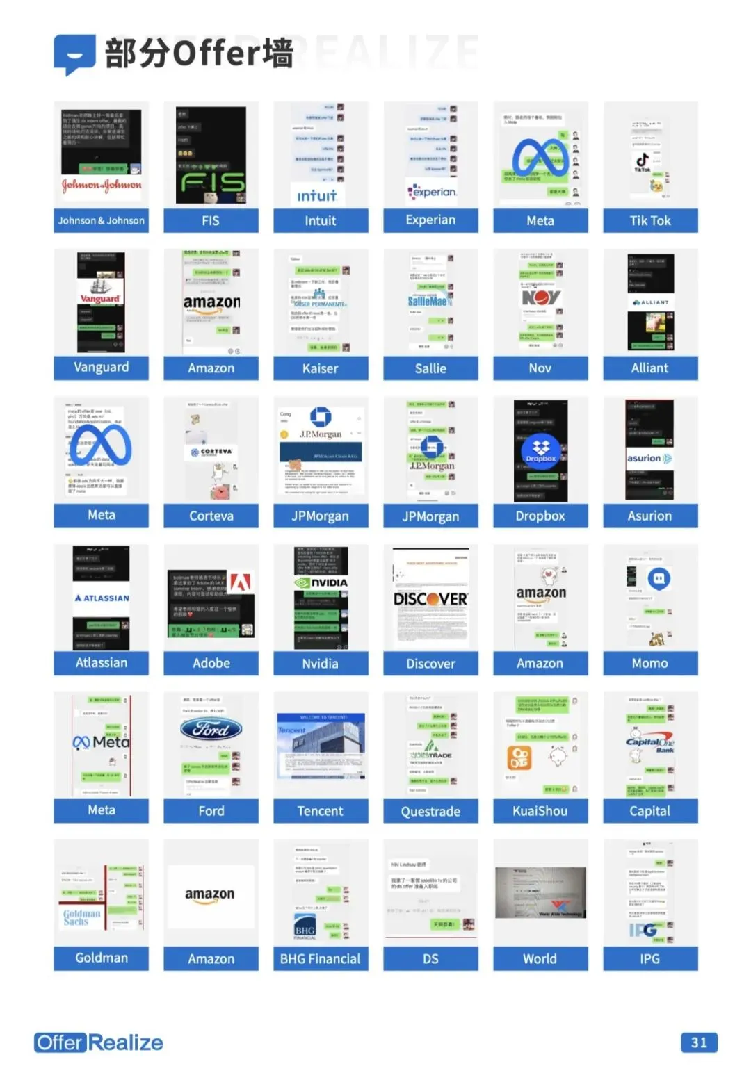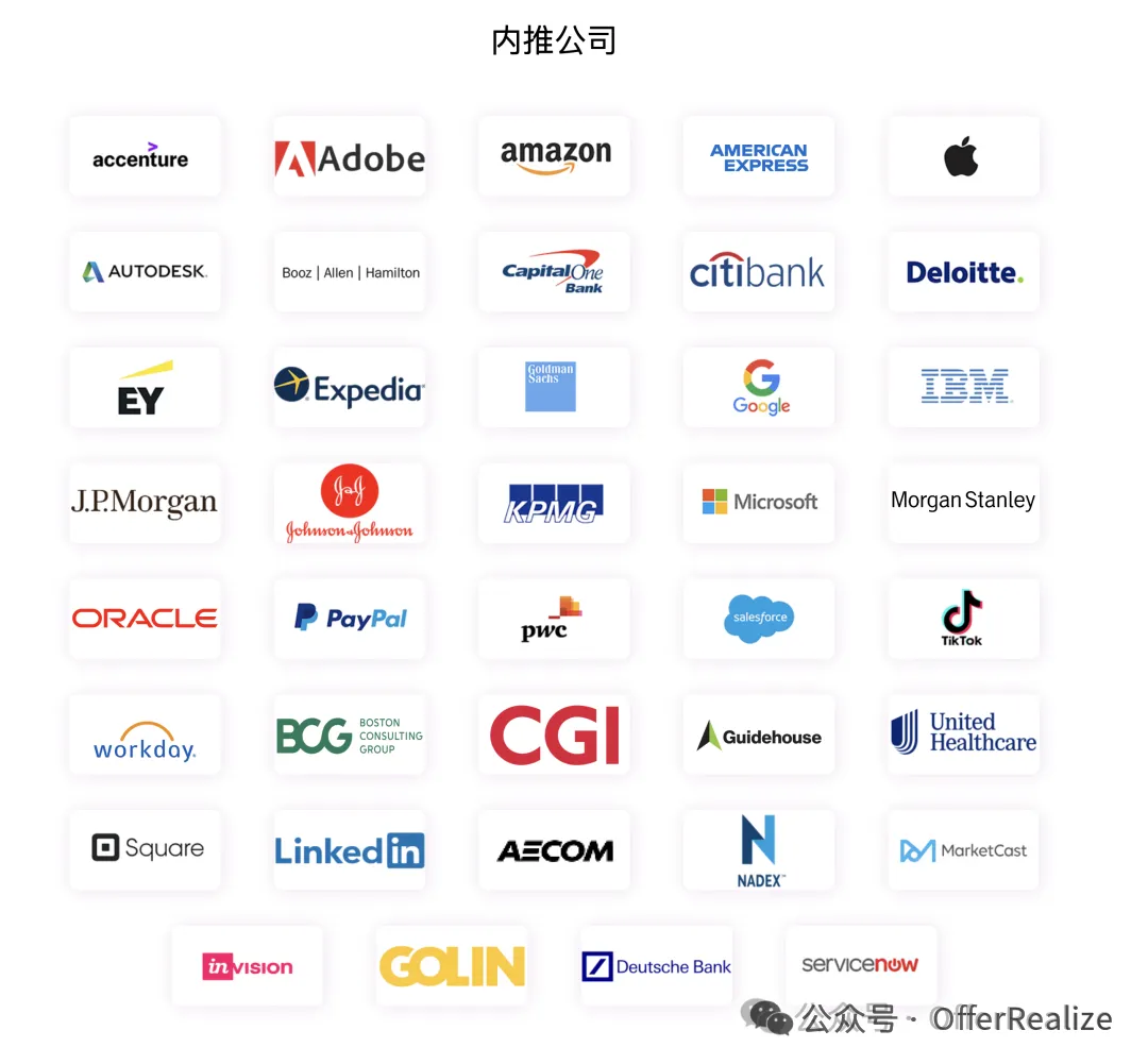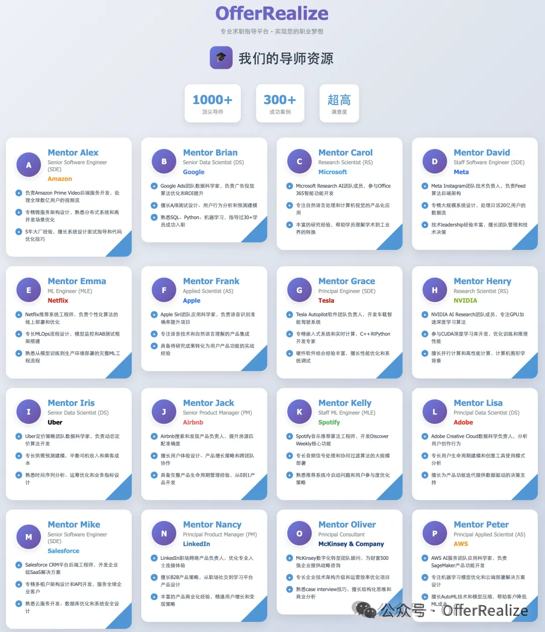 OfferRealize已经具备了非常完备的服务体系和行业top的求职结果,也招募到了更多包括Meta、Microsoft、Apple、Amazon、Uber等数据大厂;麦肯锡、Bain、BCG等知名咨询公司;高盛、JPMorgan Chase等著名金融机构以及Point72、CPPIB等金融顶级大买方的内推导师。