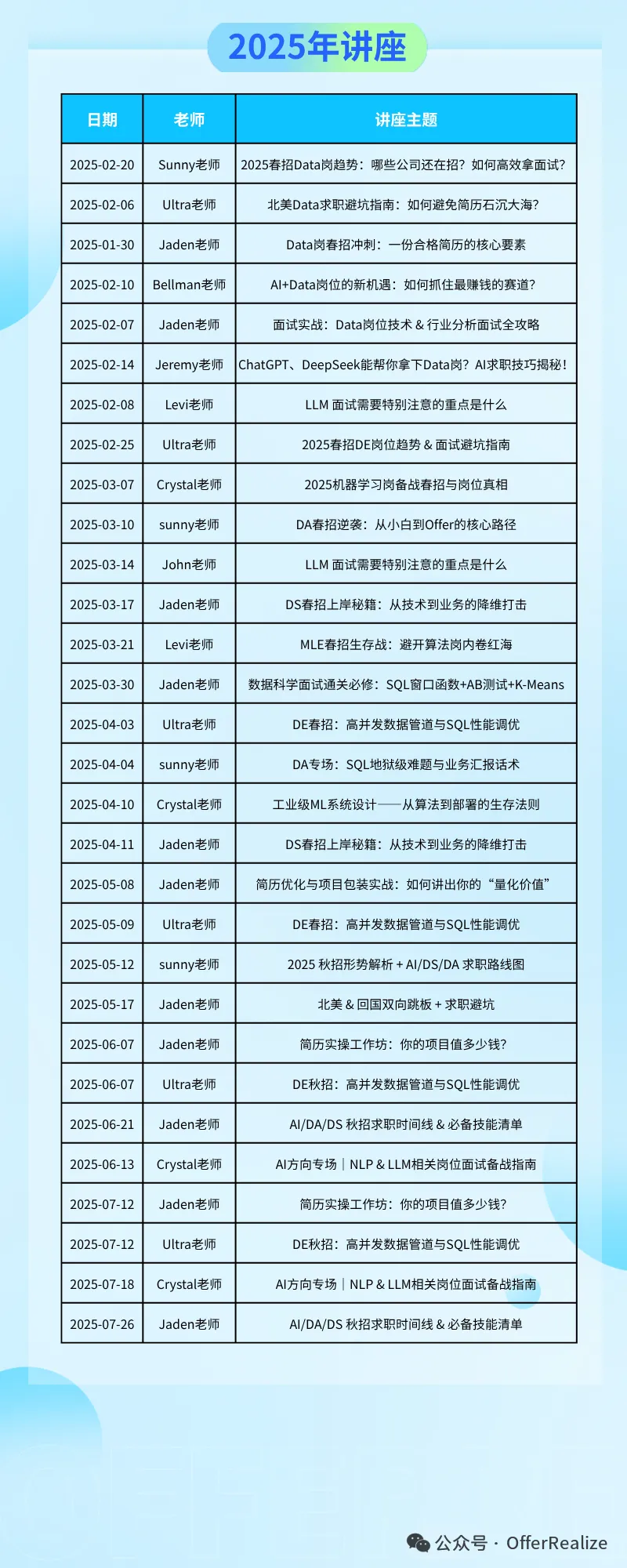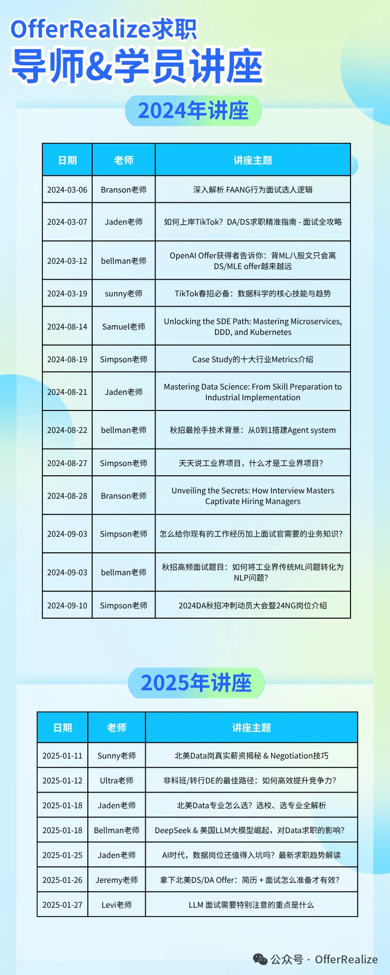 在Offer Realize,我们不仅以卓越的申请成果和深度行业干货著称,更致力于构建一个充满活力的成长社区。每年,我们都会邀请成功斩获顶级Offer的学员及任职于各领域顶尖公司的精英导师,为大家带来宝贵的求职经验分享。