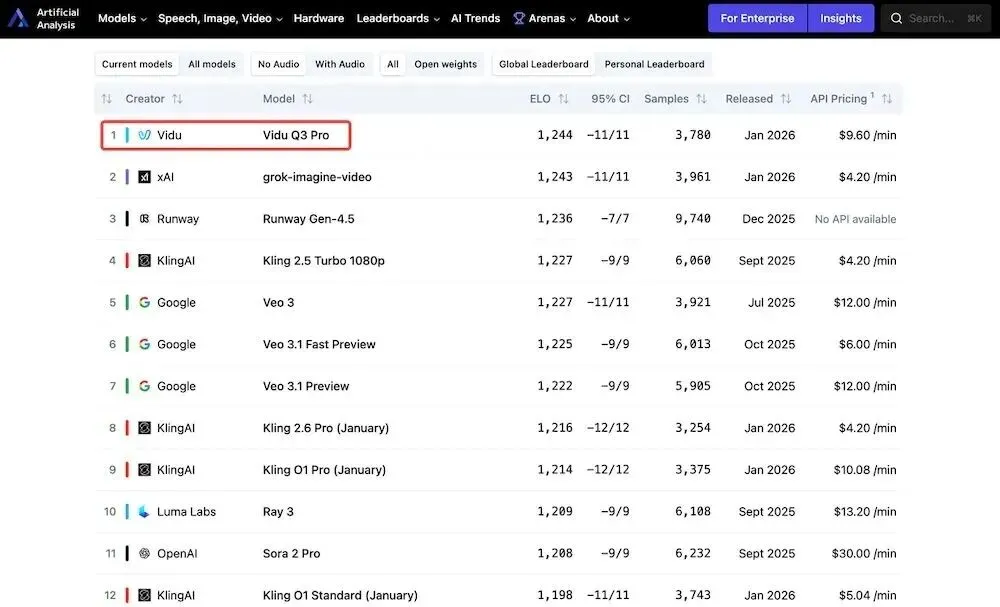 Vidu Q3,生数科技出品,刚刚登顶全球权威AI评测平台Artificial Analysis的榜首,把OpenAI的Sora 2、Google的Veo 3、Runway Gen-4.5全甩在了身后。