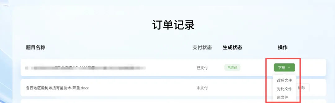 最后,细节拉满,新手也能轻松上手。降完之后支持双版本下载,一个是格式完全不变的版本,可直接提交;另一个是对比版,改动的地方会标注颜色,方便后续微调,不用逐字对照修改。而且操作特别简单,不用注册复杂账号,上传文档、选择需求,几分钟就能完成降AI率,小白也能轻松上手。