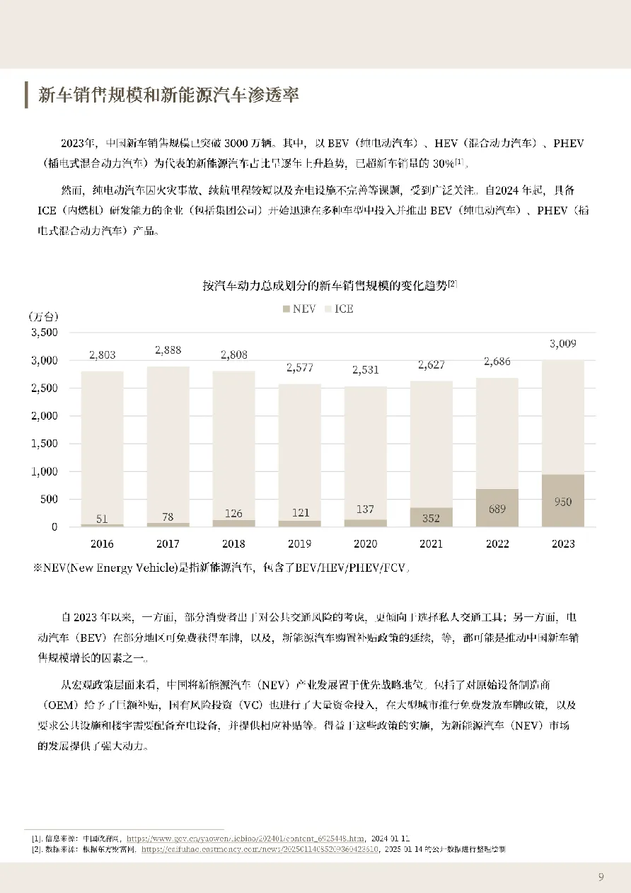 • 中国是全球最大新能源汽车市场,2023年销量超3000万辆,NEV渗透率突破30%:得益于国家层面的战略支持,包括购置税减免、免费车牌发放、充电基建补贴等组合拳,中国已成为BEV、PHEV及SDV技术落地的首选试验田。