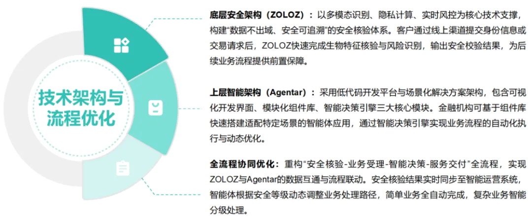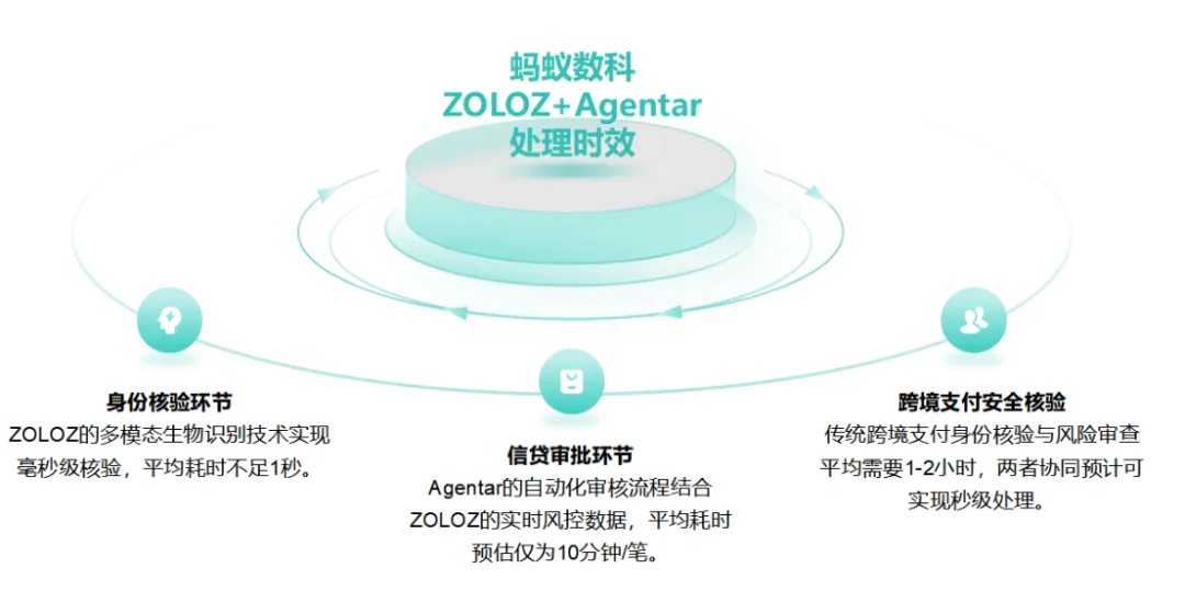 ZOLOZ与Agentar形成“安全效率+运营效率”的双重提升路径,通过技术协同实现金融服务全流程效率革命,核心解决了传统金融业务中“安全核验慢、运营流程繁、人力成本高、服务覆盖窄”的痛点问题。