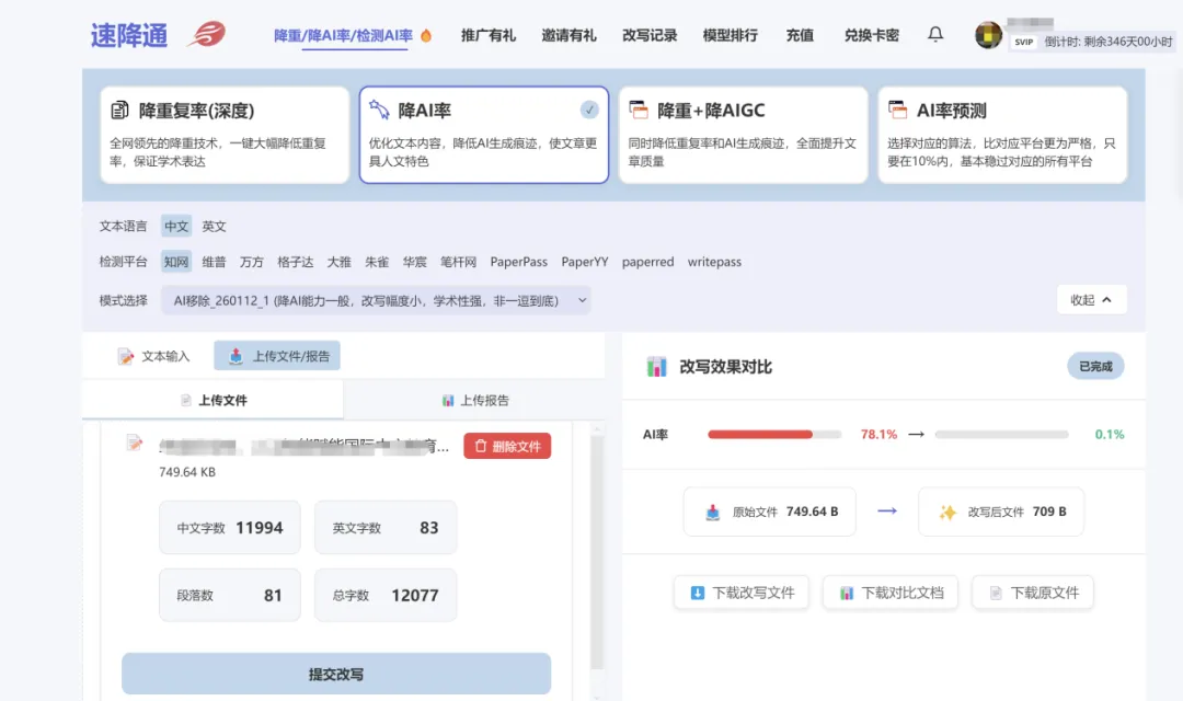 建议大家直接去速降通官网注册体验,新手还有优惠活动,花一杯奶茶的钱,就能轻松搞定AI率过高的难题,避免因为AI率问题影响毕业或工作,真的太值了!亲测不踩雷,大家可以放心冲~