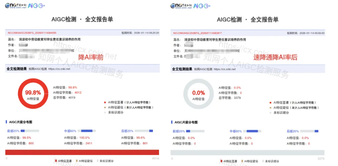 案例一:某高校本科生,论文1万字,初始AI率99%、查重率30%,使用速降通10小时,花费15元,改完后AI率0%!查重率7%,顺利通过学校知网AIGC检测和查重,导师评价“逻辑连贯,专业度在线”。