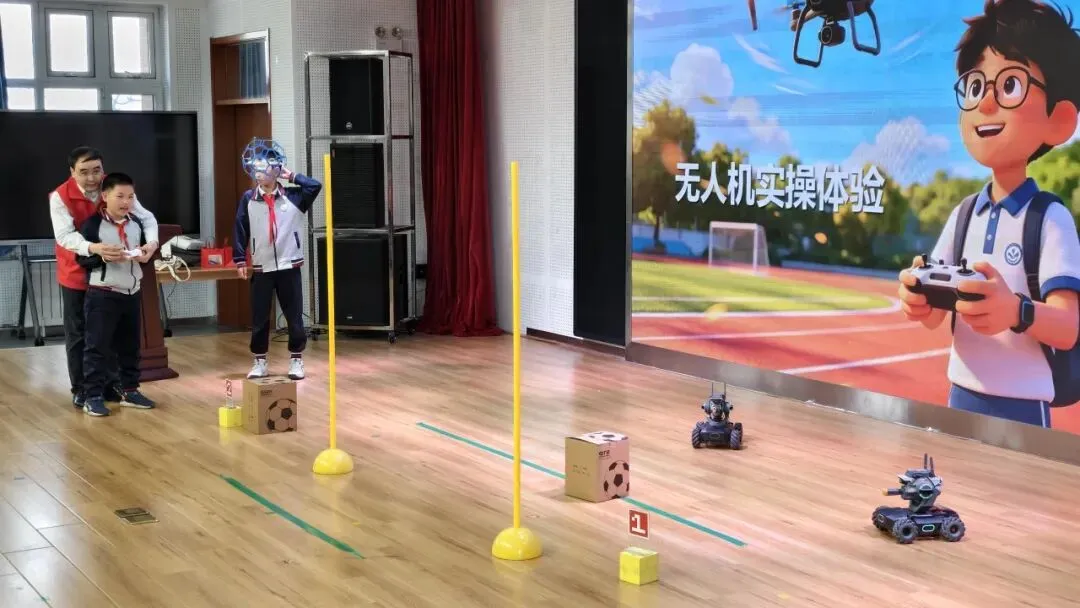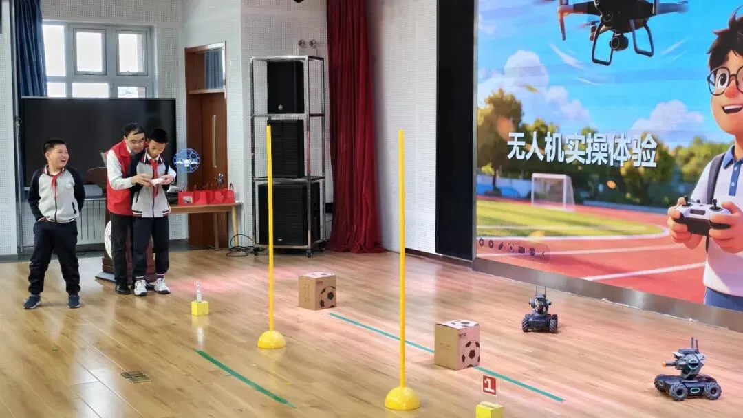无人机区更是人气满满。同学们屏息凝神,在老师指导下轻轻拨动操控杆,无人机缓缓升空,完成一键起飞、全向翻滚、自动摄录等炫酷动作。螺旋桨嗡嗡转动,机身在空中灵活盘旋,孩子们仰着小脸追随着无人机的身影,激动地拍手叫好。在近距离体验中感受人工智能的神奇与魅力,欢声笑语充满整个活动现场。