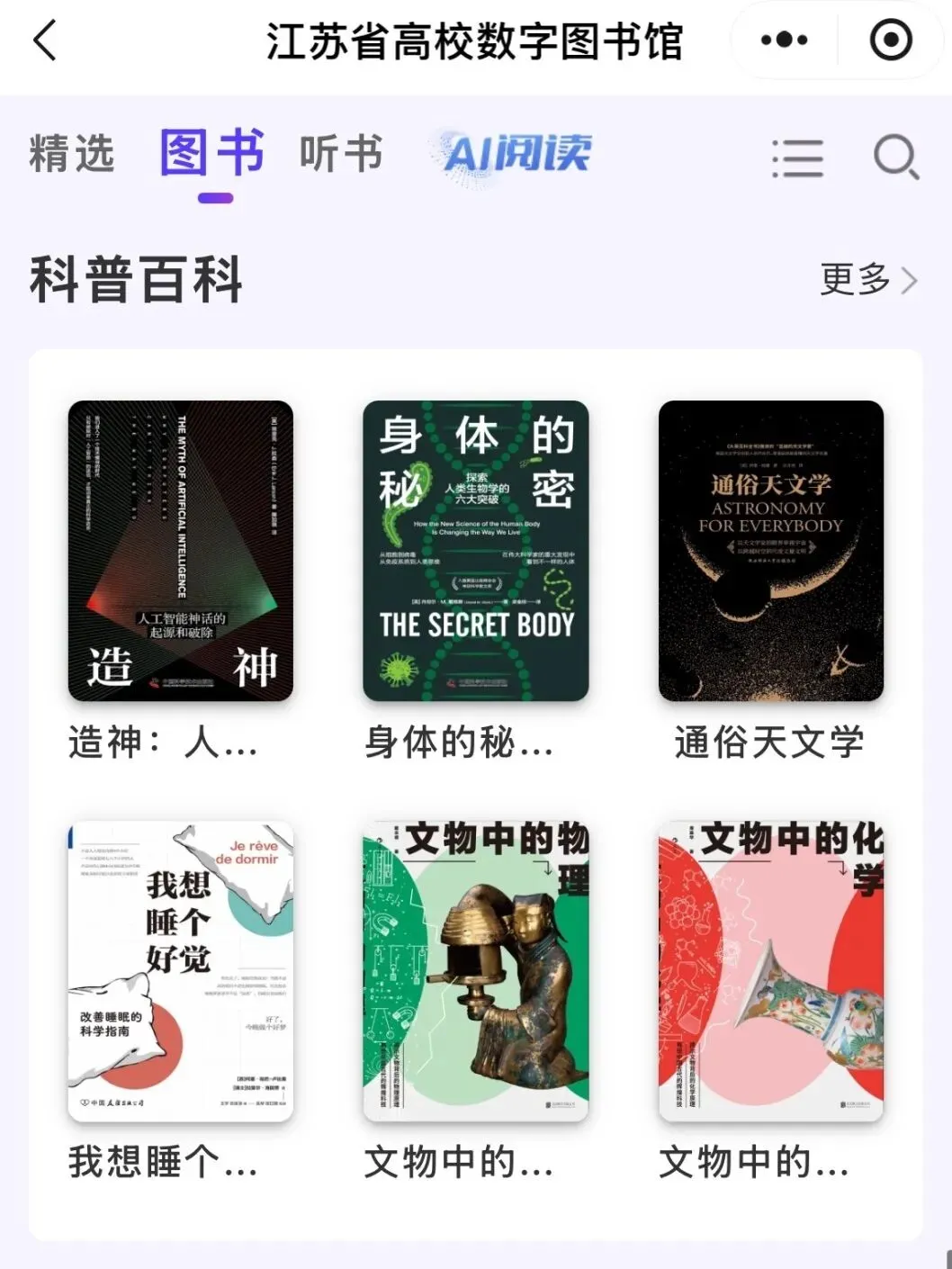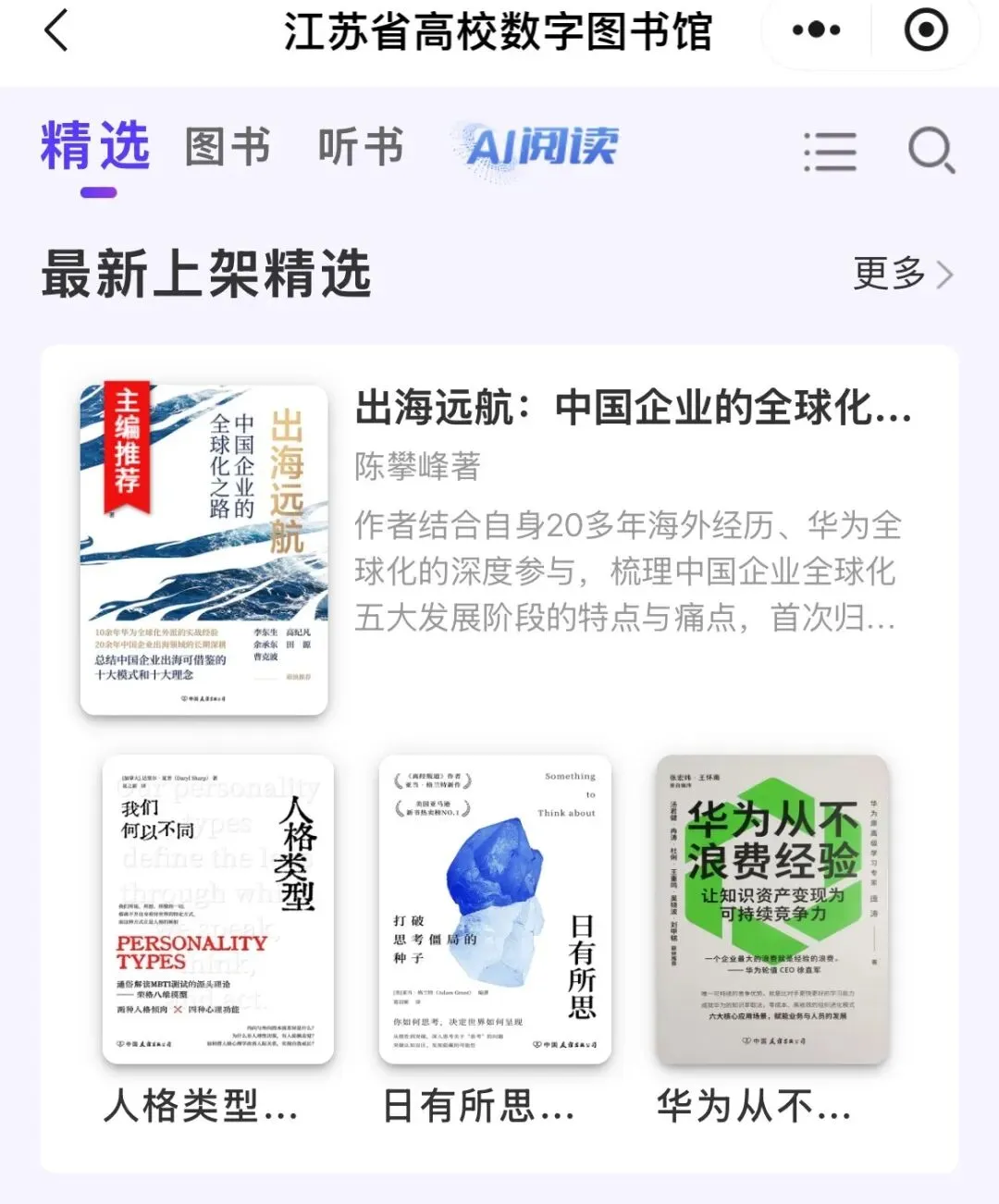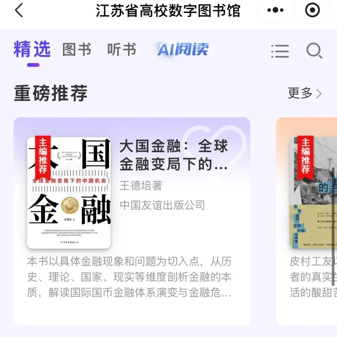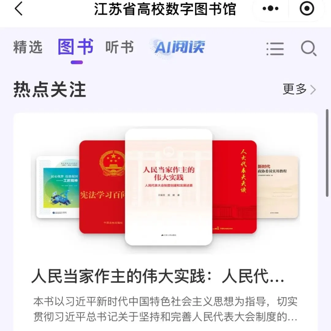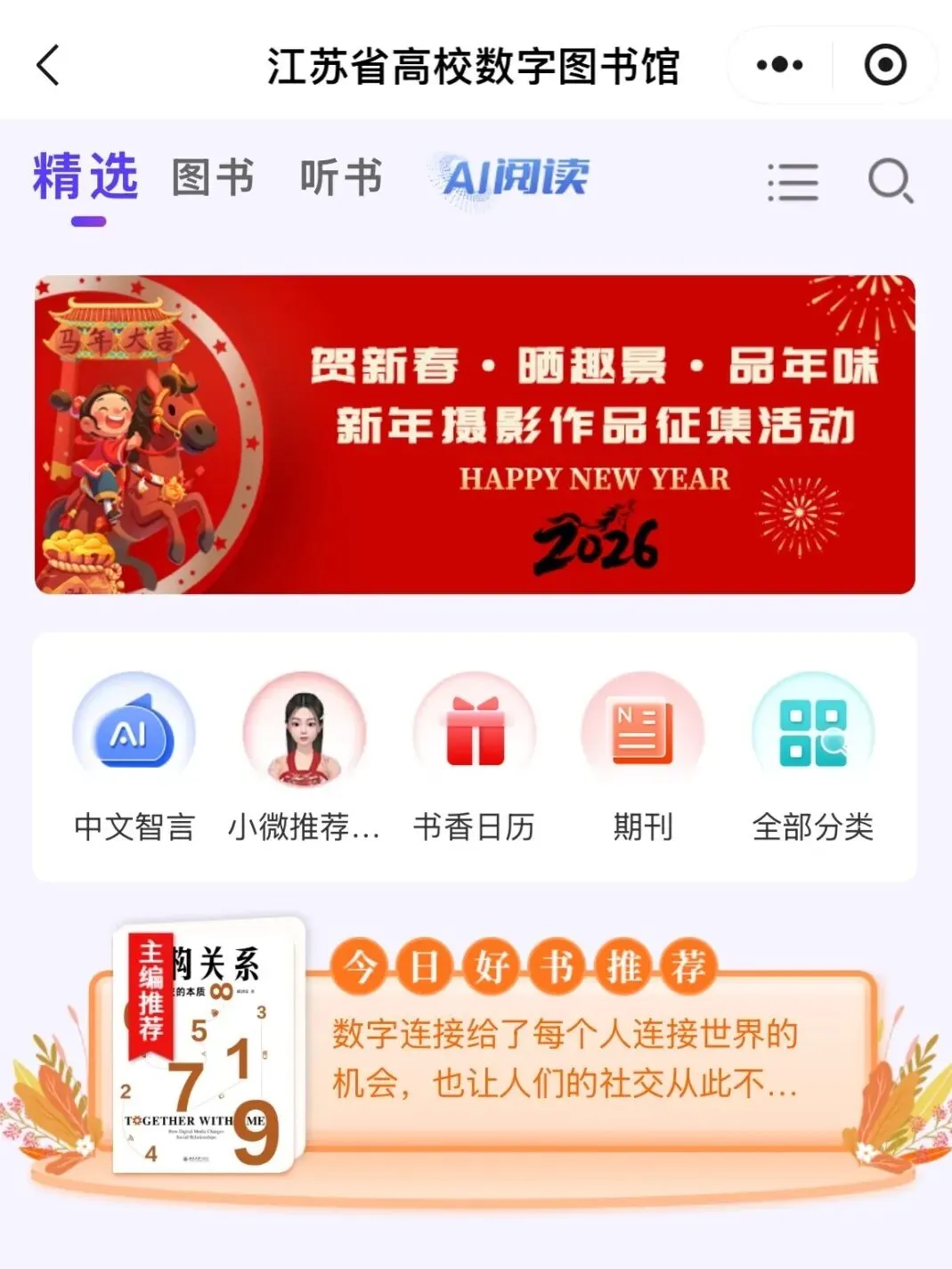 通过江苏省高校数字图书馆(JALIS),我们可以轻松访问中文在线海量电子资源,50万册电子图书、7万集听书、千余种期刊,还有基于AI大语言模型的“中文智言”智能对话系统,将为你的学习、科研和生活带来前所未有的便利,全面助力高校师生在学术探索、知识积累与学科发展上取得更加卓越的成果。