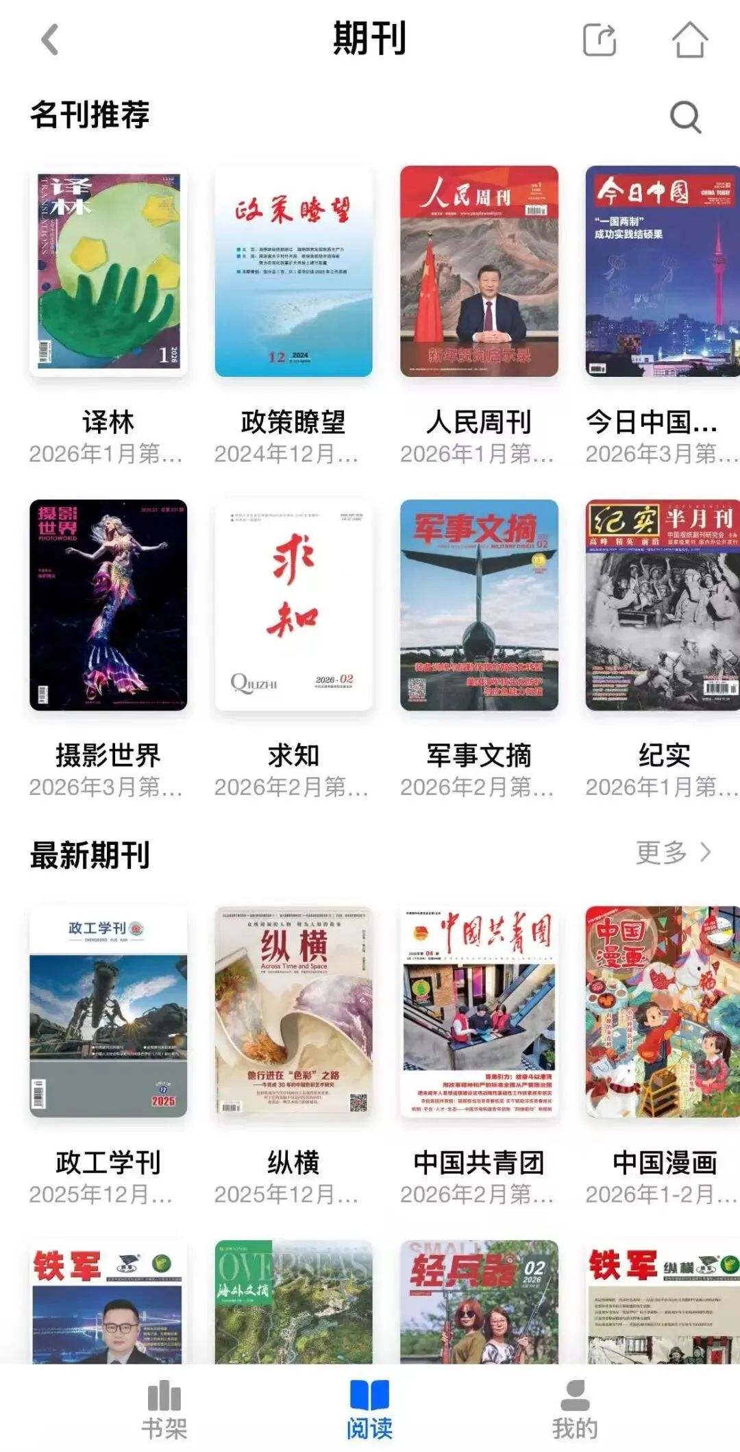平台拥有1千余种电子期刊,包括商业财经、时尚运动、休闲娱乐、汽车数码、科技科普、政法军事等共计12大类。收录了《财经》《青年文摘》《三联生活周刊》等著名期刊杂志,每日更新,让你始终站在资讯前沿。