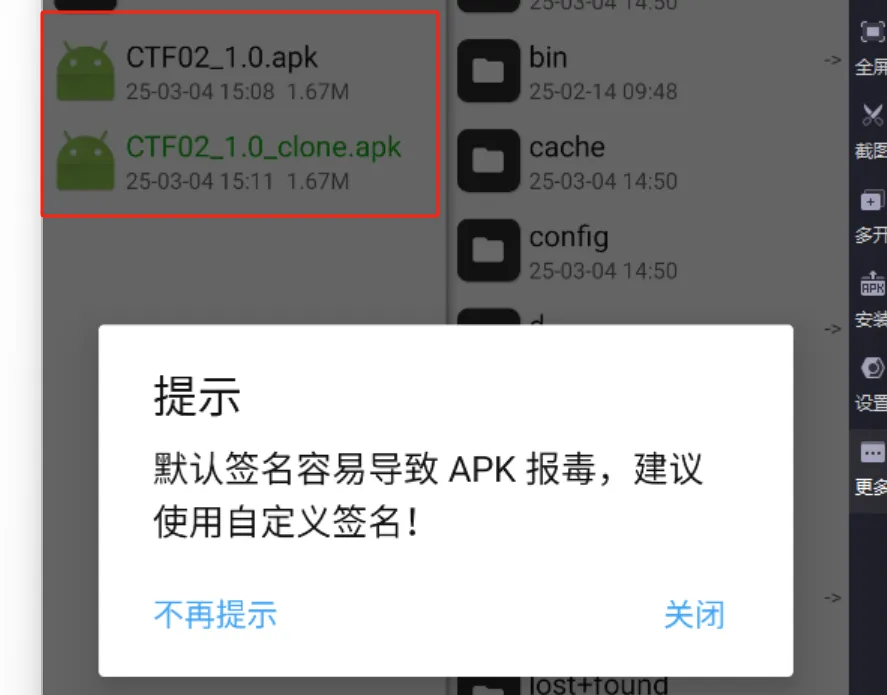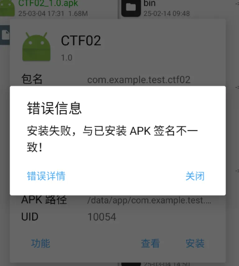 我们发现第二次签名后软件可以直接安装成功,原因是MT自带的签名信息一致,不会出现签名信息冲突的情况,可以直接覆盖安装