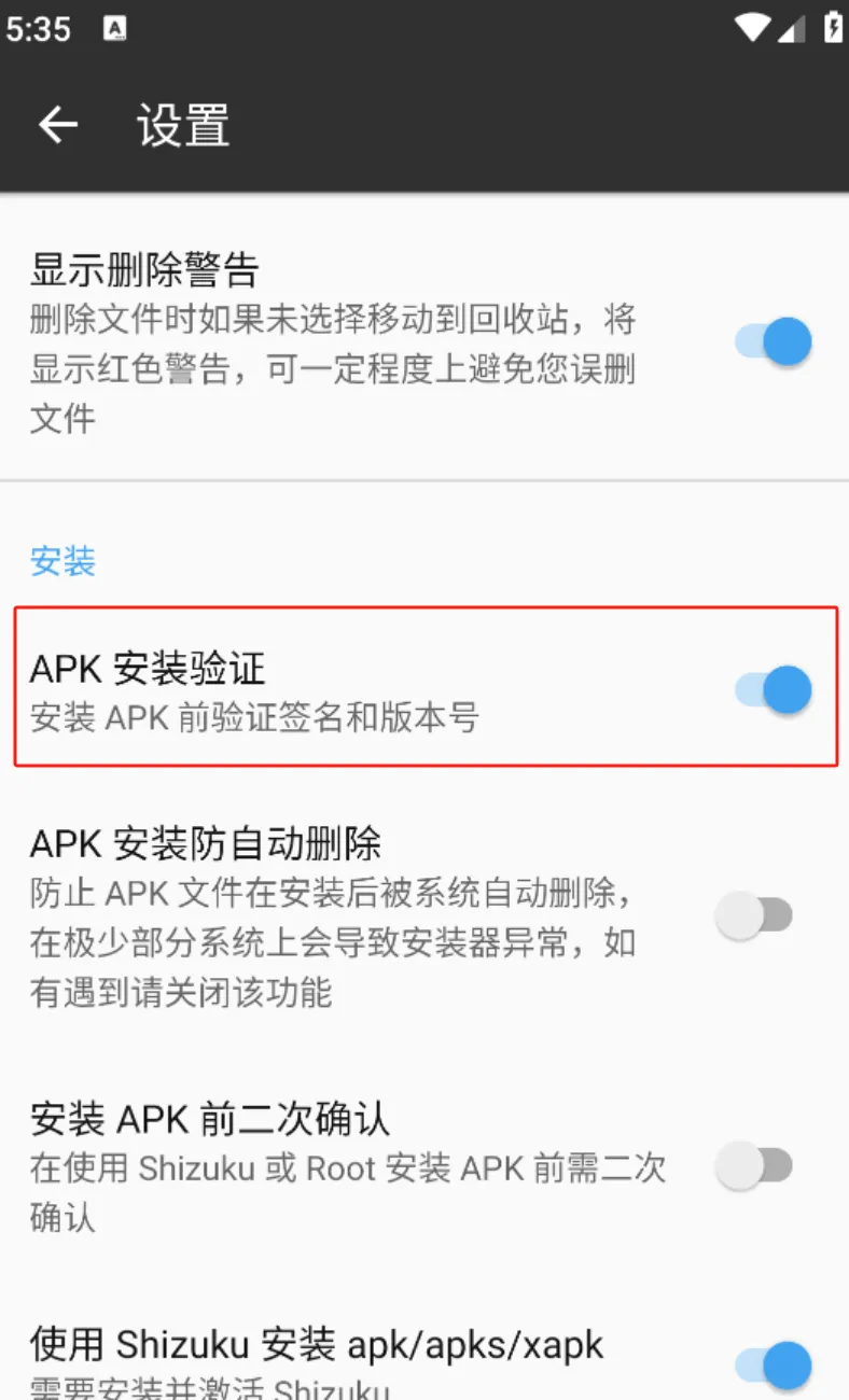 7.对于卸载提示可以直接关闭处理,在设置里的APK安装检验证关闭就不会再提示