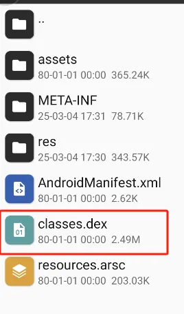 /classes.dex文件 :是应用程序的 Java 或 Kotlin 编译生成的字节码文件,包含应用程序的执行逻辑。 -