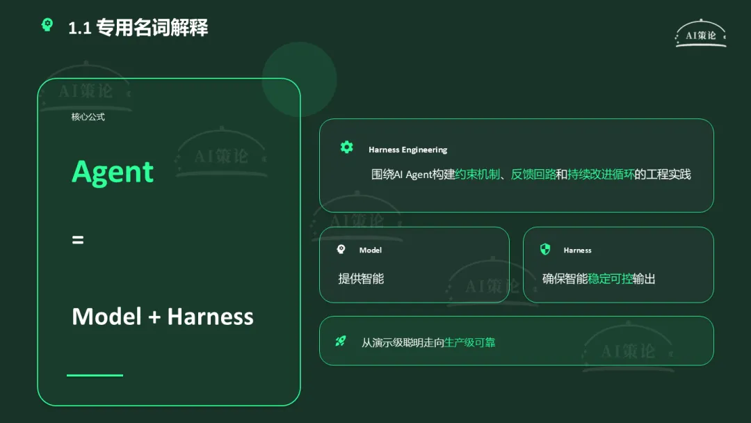 大模型提供了智能,但Harness(驾驭层)确保这些智能能够在企业级应用中稳定、可靠、安全地运行。就像一匹千里马需要好的马鞍和缰绳,AI Agent也需要完整的工程化体系来驾驭。