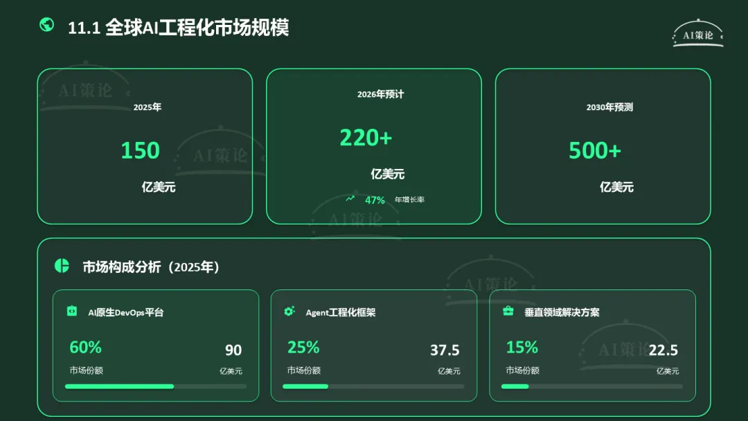 2025年:全球AI工程化市场规模约150亿美元2026年:预计达220亿美元+,年增长率47%2030年:预测突破500亿美元