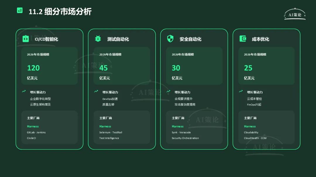 市场构成中,AI原生DevOps平台占60%(约90亿美元),Agent工程化框架占25%(约37.5亿美元),垂直领域解决方案占15%(约22.5亿美元)。