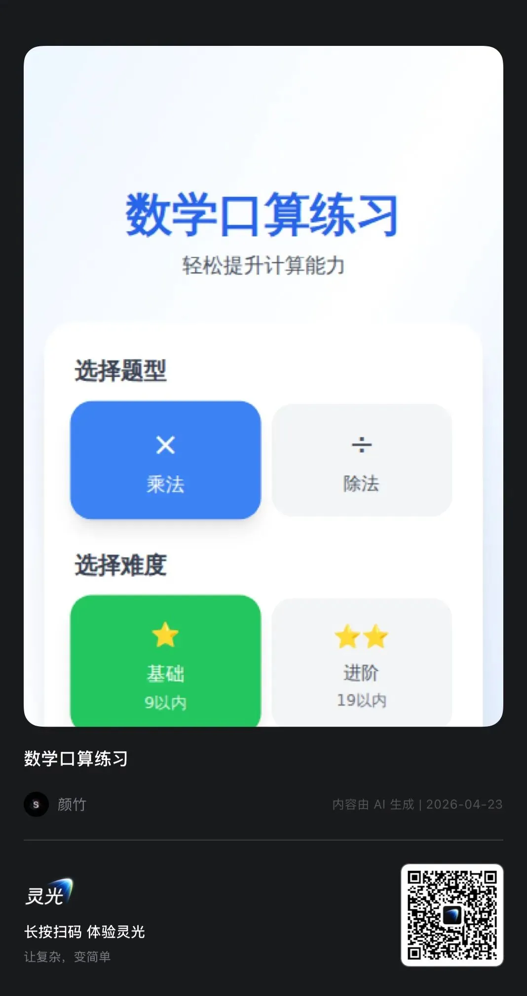 我用5分钟做出来的App,反而帮我很大忙:差点被我遗忘的第6个 这个App之所以被我遗忘,大概是因为它诞生得太丝滑了。5分钟完成,零波折上线,连“创业故事”都没有。 说回孩子的学习, 学习上遇到的问题远远不只有背单词。 比如口算,就是每个二年级小孩都绕不过去的一关。 可是,口算练习册过于枯燥。 市面上的口算App过于花哨,真的需要那么多动画、奖励、按钮和功能吗? 对孩子来说,容易分心。 对家长来说,也容易疲惫。 我需要的,是一个随机出题,能迅速出题的小工具。 我陪他练习的时候可以用;他想自己挑战自己的时候,也可以用。 这一次,我选择了用灵光。 输入几句简单的提示词。5分钟后,这个小工具就做好了。 没有复杂界面, 没有升级系统, 没有花里胡哨的设计。 它甚至很难被叫作一个“App”。 它只是一个口算出题器。 我很快把它分享给几位同学家长。 大家的反馈是: 孩子对它的接受度,比书面练习好很多——愿意练,练得很开心。 很多人认为,好工具一定要复杂,要有完善的功能。 但这次我更确定了一件事: 一个工具好不好用,不在于它有多复杂。 而在于它是不是刚好够用。 有的时候,少即是多。