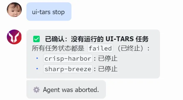 如果你需要中途停止正在执行的 UI-TARS 任务,可以使用 stop 命令: