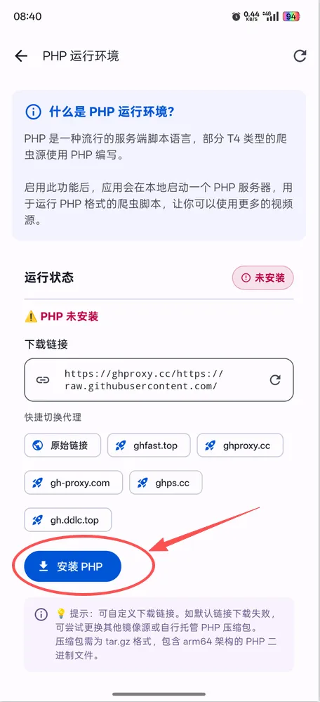 4、进入到php环境页点击【安装PHP】