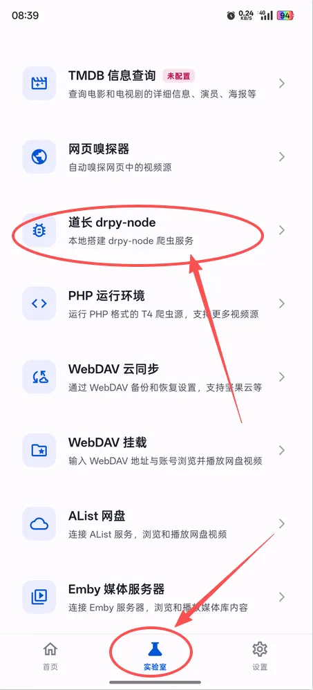 6、回到【实验室】页面,点击【道长drpy-node】