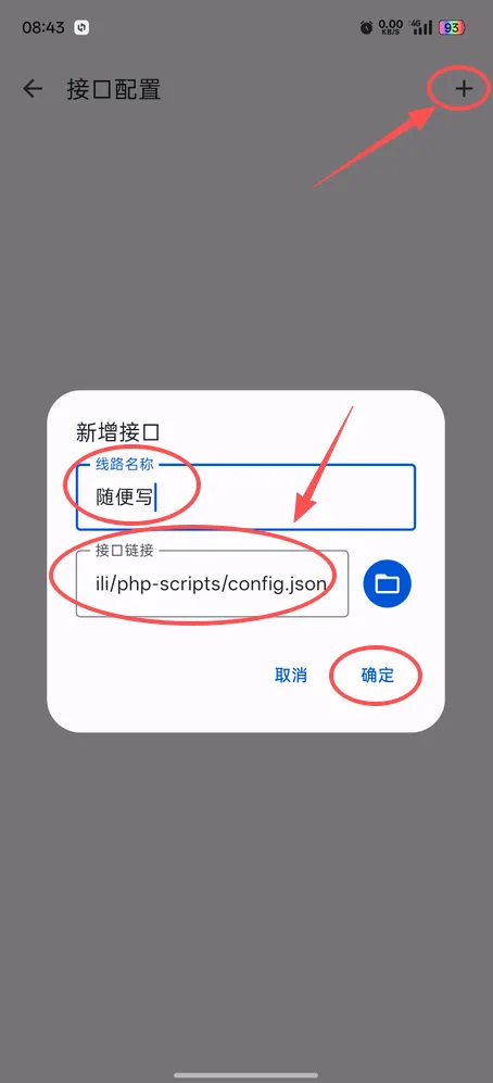9、点击右上角的【+】,然后填写接口,线路名称随便写,接口链接填写这个【/storage/emulated/0/peekpili/php-scripts/config.json】或者直接点击边文件夹图标,一层层选到config.json这个文件即可,然后点【确定】