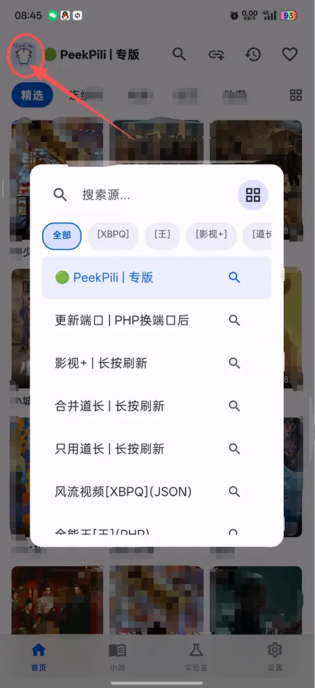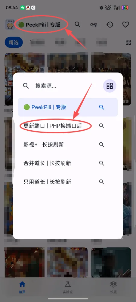 10、进入【首页】,点击上方的【PeekPili|专版】文字,打开源列表,并点击【更新端口|PHP换端口后】