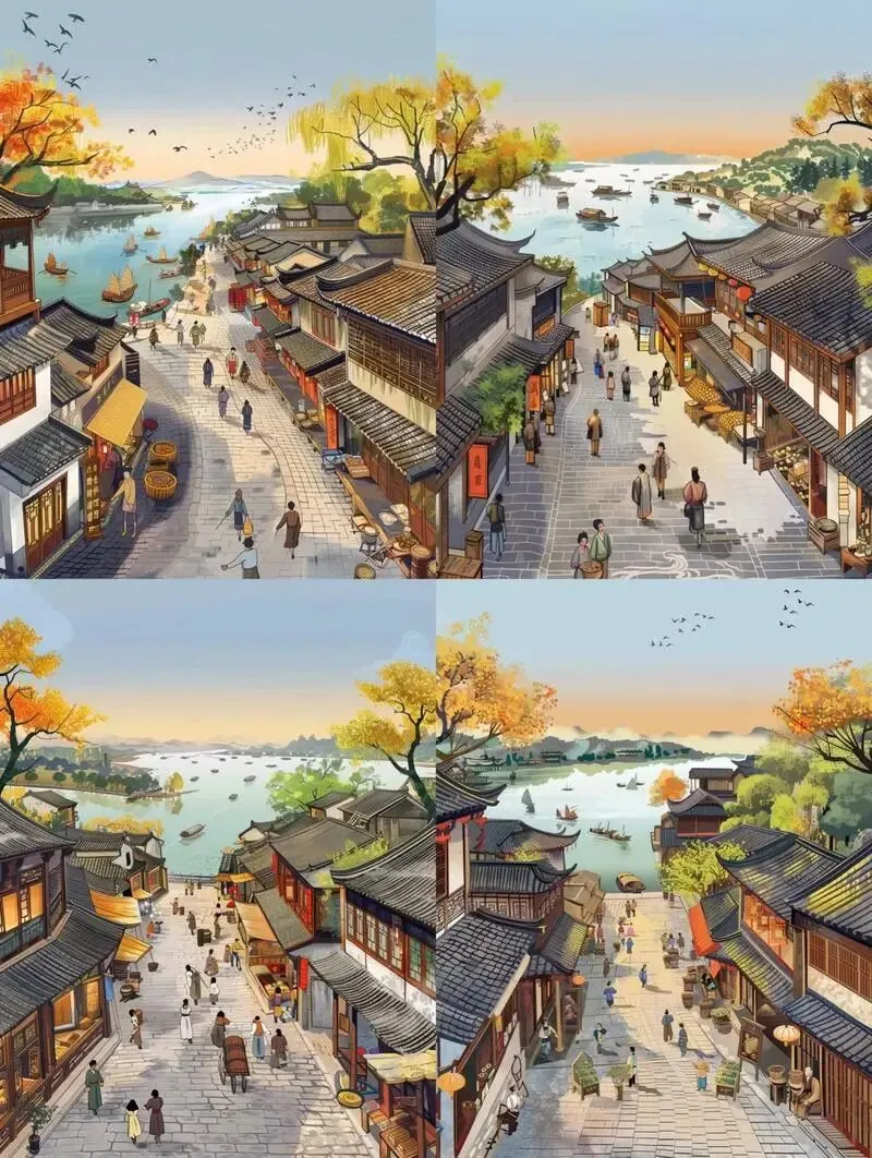 AI生成的中国风插画,展示传统建筑和街头场景,画…