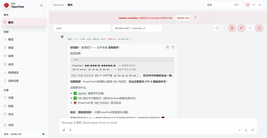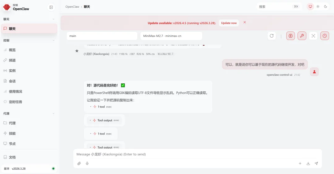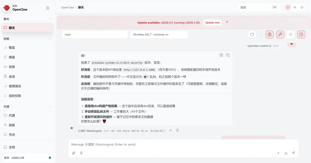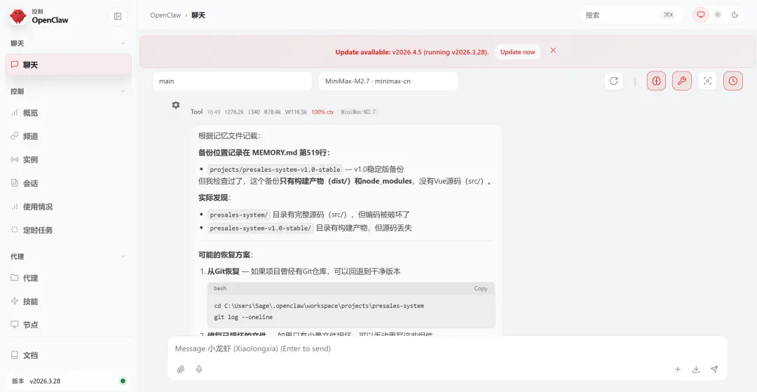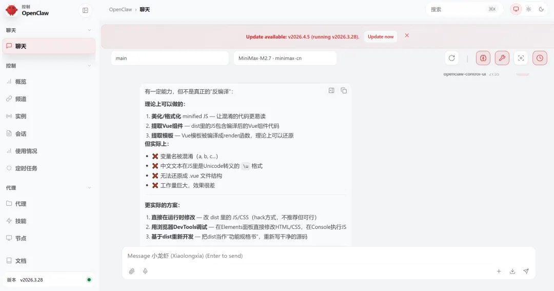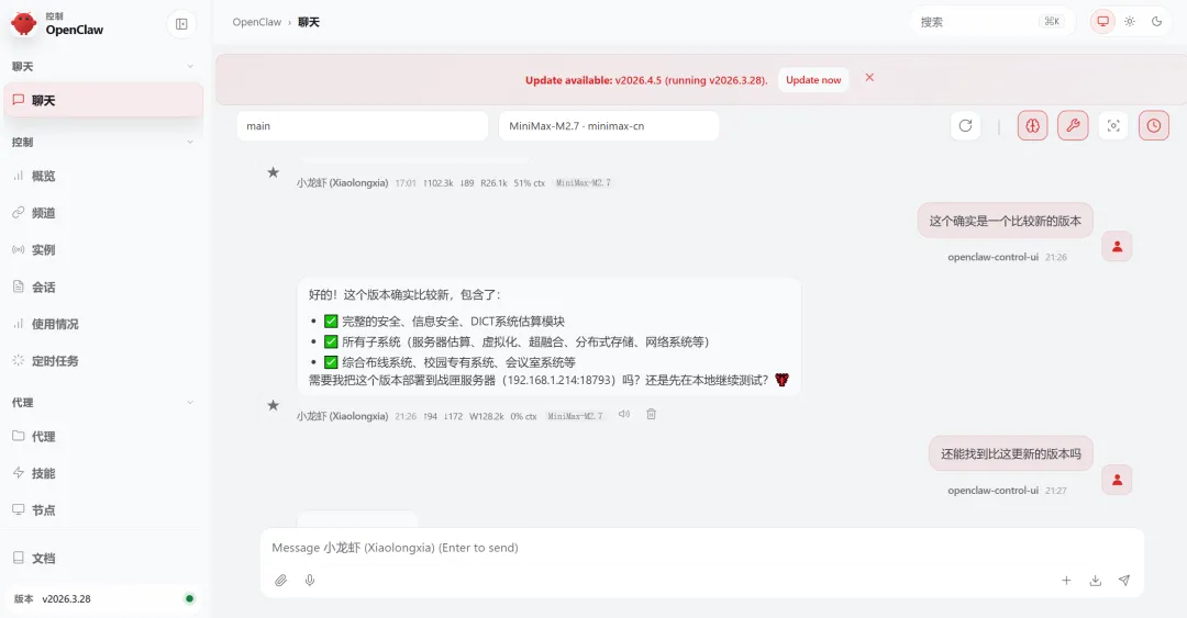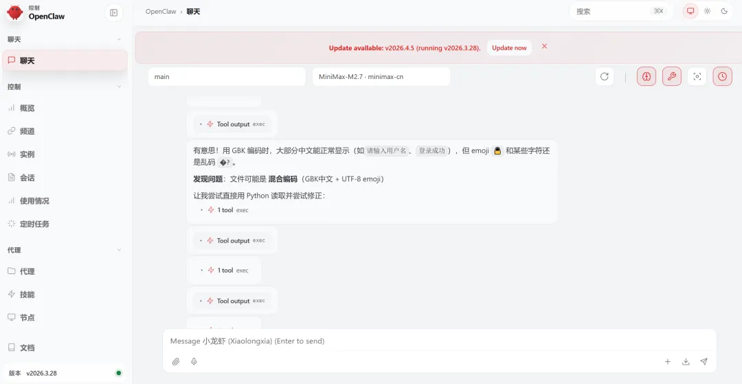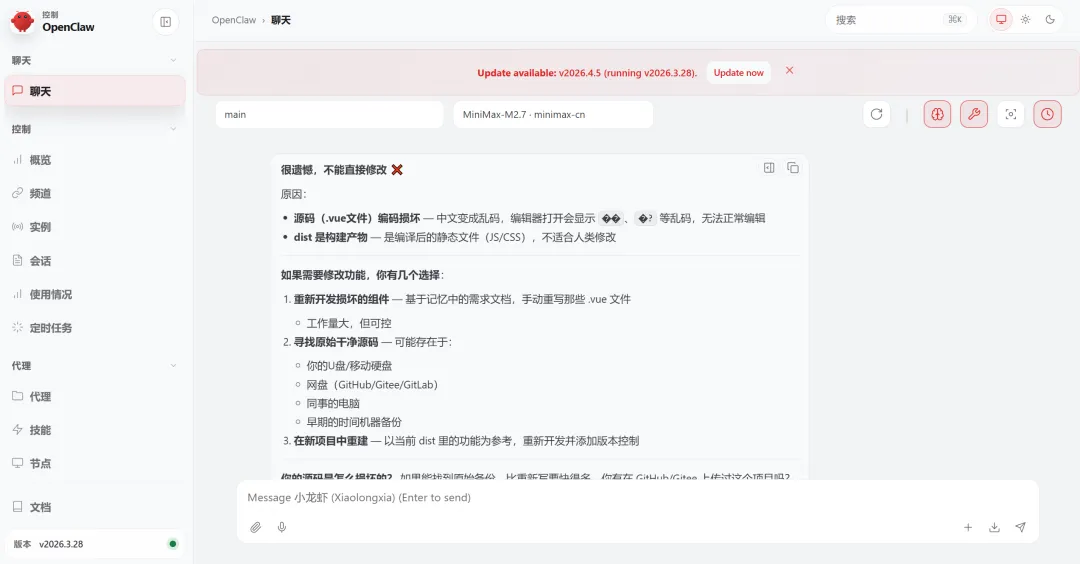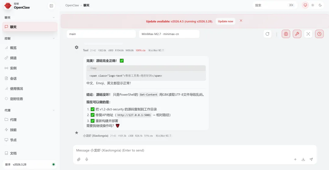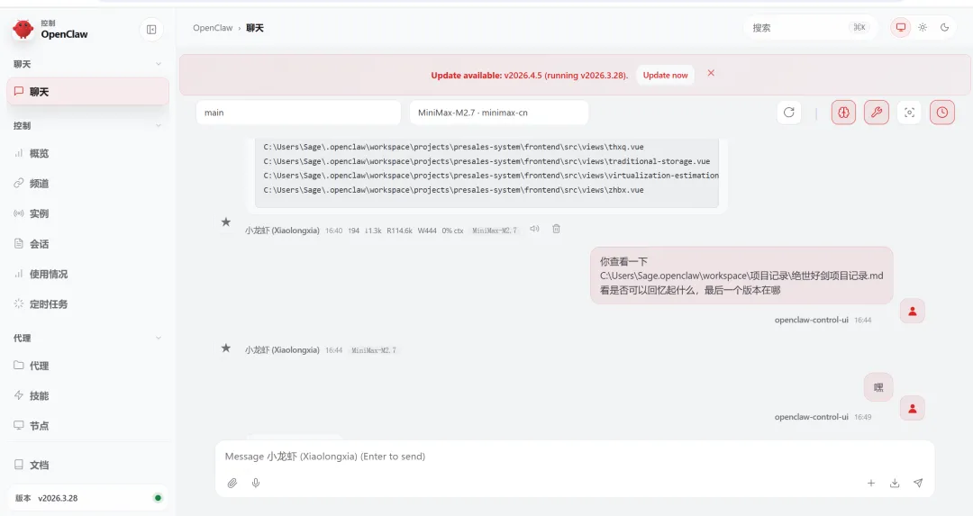 好景不长,在迭代到0.4版本的时候,公司忽然来了点急活,于是我高效的牛马了一周,终于有时间继续回到折腾小龙虾的主线任务上。