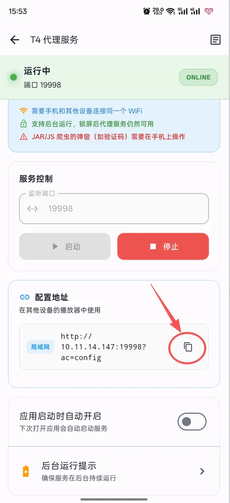 3、服务端即可启用成功,复制下面的配置地址(如下图),然后去接口配置里面配置好在线接口或本地包。在其他局域网设置的接口配置里,粘贴刚才复制的配置地址,即可调用手机上的本地包或接口观看。
