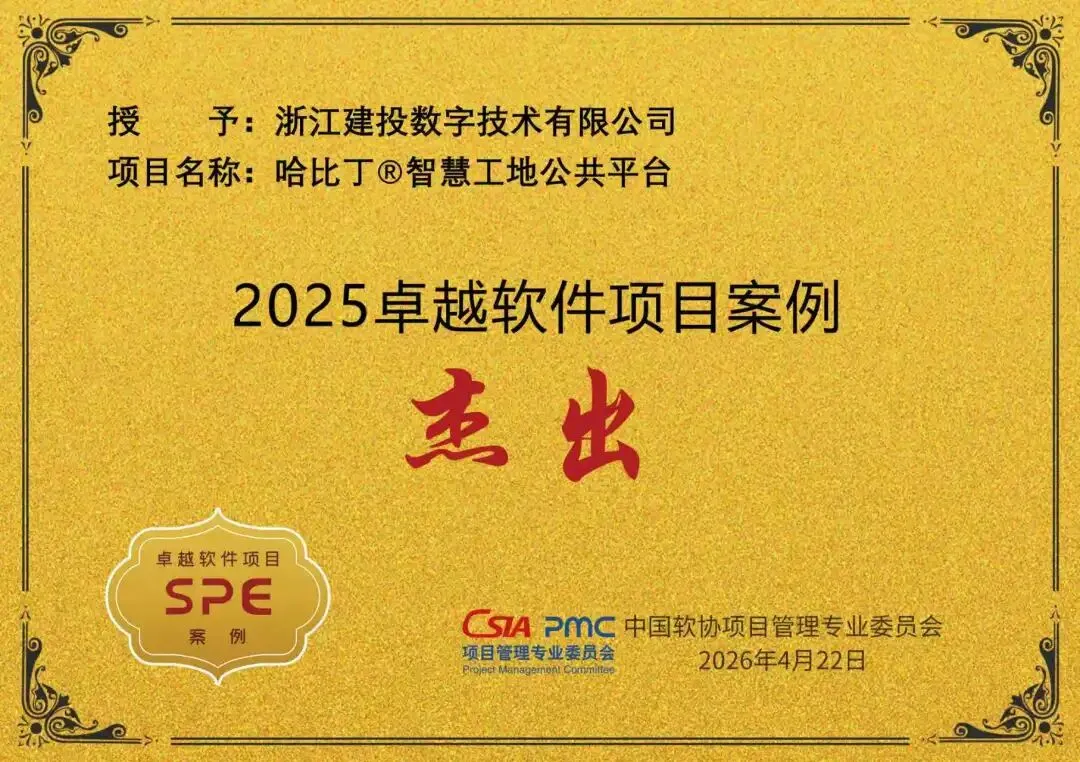 日前,由中国软件行业协会主办的第九届(2026)中国软件项目管理高峰论坛正式发布2025年度卓越软件项目案例评选结果。全国共有62个案例入围,其中,浙建数字自研的“哈比丁®智慧工地公共平台”被评为全国“杰出案例”,成为该榜单中获此荣誉的十个项目之一。