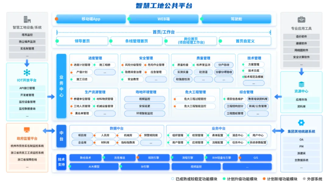 平台立足建筑行业重大需求,以全域、实时、高质量的工地数据汇聚为基础,全力支撑企业在质量、安全、成本、设备等关键领域的精准监管、智能预警和科学决策,提升工地的精细化管理水平。平台致力于构建开放、协同的行业生态系统,通过统一数据标准,提供开放API接口,积极推动多元主体参与,在坚实的安全基座上,促进数据要素的安全有序流通与价值释放。
