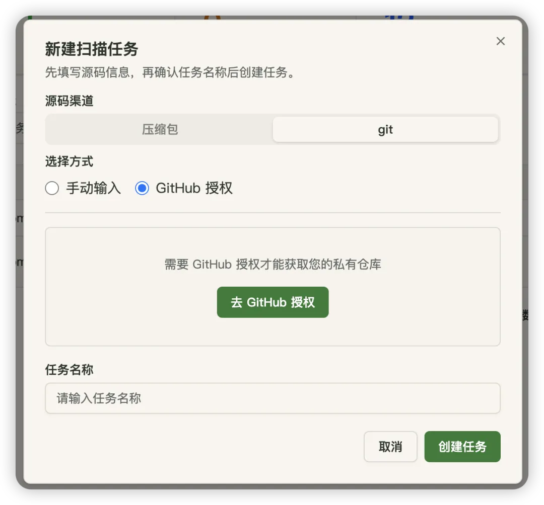 仅需上传 ZIP 包或者 Git 仓库地址即可开始任务(也可以通过 Git授权认证)