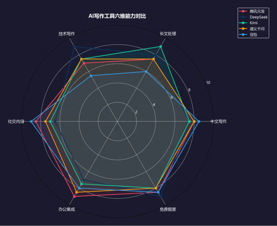 本次测评对象:腾讯元宝、DeepSeek、Kimi、通义千问、豆包。测评维度包括中文写作、长文处理、技术写作、社交内容、办公集成、免费额度六个方面。