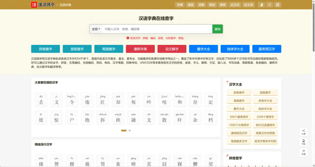 (汉语国学网)是一个免费、专业的在线汉字与国学学习平台。网站收录汉字超9.4万个,远超《新华字典》,其中有简体、繁体、异体字与生僻字等,是国内汉字收录量领先的在线字典之一。