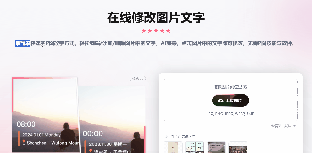 软件通过AI 一键改字功能:上传图片后自动识别文字,点击即可直接改写,AI 会智能匹配原图字体、颜色、透视与光影,同时无痕修复背景,无白边、重影或色块。