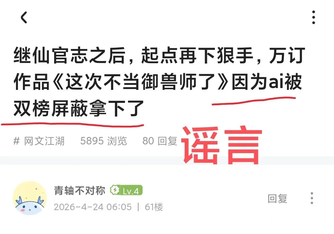 今天是2026年4月24日。大家早上好。大家都知道网文圈的龙空论坛吧。我刚刚去刷了一下,看到一个特别荒诞的热搜帖子。帖子截图如下:起因是起点一本万订作品《这次不当御兽师了》,突然从月票榜、畅销榜双双消失了。这个消息一出,在整个网文圈瞬间传开。龙空论坛上大部分人都下意识跟风定论:绝逼又是起点在严打 AI 水文,这本书肯定是 AI 写的,被平台处罚下榜了。截图如下:短短一天的时间不到,关于这本书的谣言铺天盖地,满天飞。不少不知情的读者、路人跟风嘲讽,说现在的万订书水分太大,全靠 AI 凑字数,平台整治是迟早的事。但事实真的是这样吗?我蹲完了龙空所有的相关的复盘帖子,看完所有知情大佬的爆料,最后笑了,只想说一句:这波纯属全网脑补,无稽之谈。大家所谓的 “起点严打 AI”,从头到尾,都是一场轰轰烈烈的乌龙谣言。那情况到底是怎么一回事呢?PART 01没有任何官方实锤的AI谣言首先。关于这一次事件,最核心的一点就是,从头到尾,没有任何的官方实锤。也没有作者的留言说明。更没有平台的处罚公告,也没有什么后台的违规记录截图,没有任何官方渠道指出这本书存在 AI 创作问题。谈论截图如下: