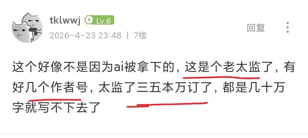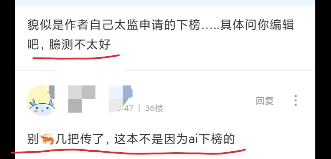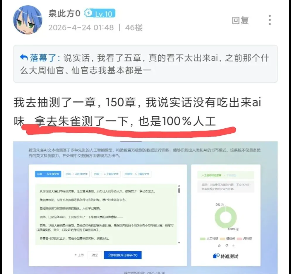所有的 “AI 下榜” 结论,全部来自网文圈一些网友的主观猜测和臆想。而为了验证真相,证明这本书究竟是不是AI创作导致的下架,还有读者专门抽样检测了这本书的正文内容。用专业的 AI 文字检测工具——朱雀筛查,结果是百分之百人工原创。论坛截图如下:其实抛开工具数据,单纯从读者视角去读,这本书的行文节奏、人物情绪、剧情细节,都是很典型的人工网文风格。有瑕疵、有水文、有节奏崩坏,但这都是真人作者会犯的毛病,和千篇一律、逻辑僵硬的 AI 文稿,有着天壤之别。PART 02真相:作者主动申请切书下榜那好好的万订书,为什么会突然双榜消失?我看完了所有帖子之后,发现真相其实特别简单,也特别有趣。大家也知道,这本书的作者飞天小奶盖,是网文圈公认的 “老太监”。熟悉或者曾经看过这位作者的书的网友或者书迷都知道,这家伙是惯犯了。他不是第一次写出爆款网文。真相截图如下:但他的通病一直没变:书写到中后期,就会彻底崩盘。小说剧情套路重复,爽点彻底枯竭,内容越写越水,自己完全接不住故事。这个作者,特别的地方就在于什么?他写不下去的时候,就主动切书、停更烂尾。甚至还主动下榜。这一次也不例外。这本书后期的内容质量肉眼可见的下滑,剧情拖沓冗余,没有新意,作者早就写不动了。根据龙空知情人士爆料。这一次事件其实是作者自己主动申请下榜,选择切书完结,根本不是平台的 AI 处罚。截图如下: