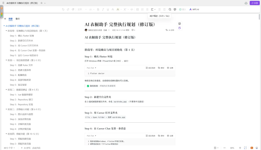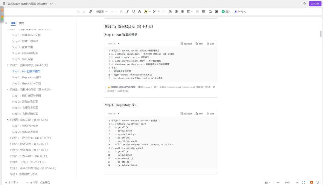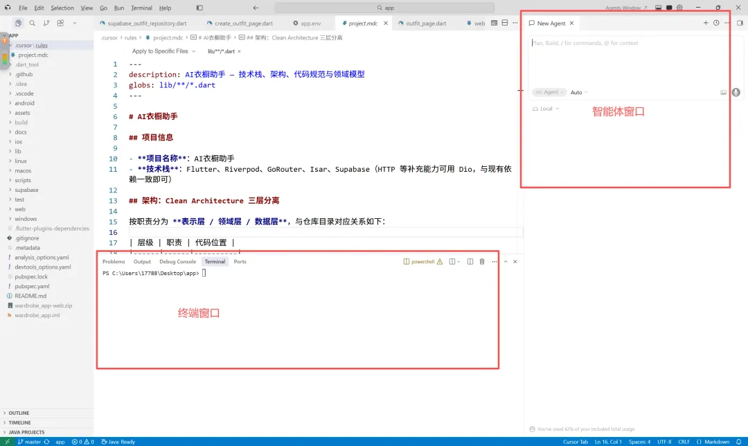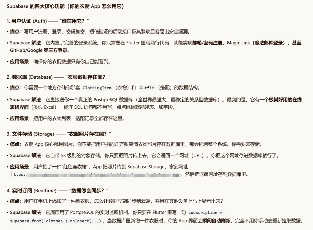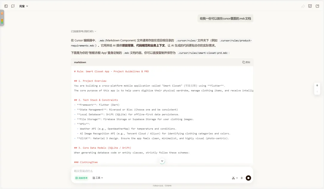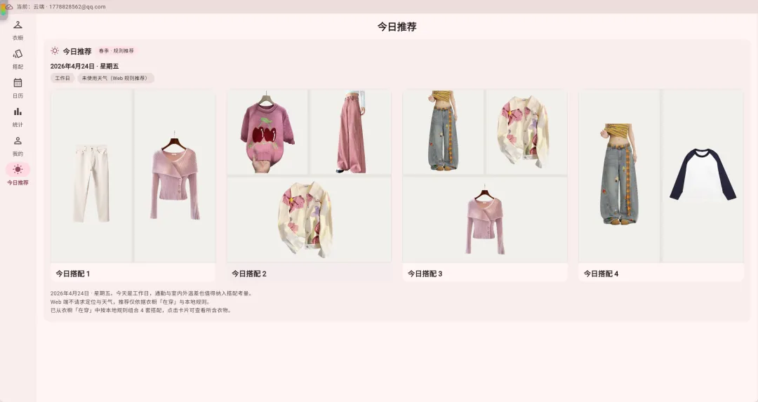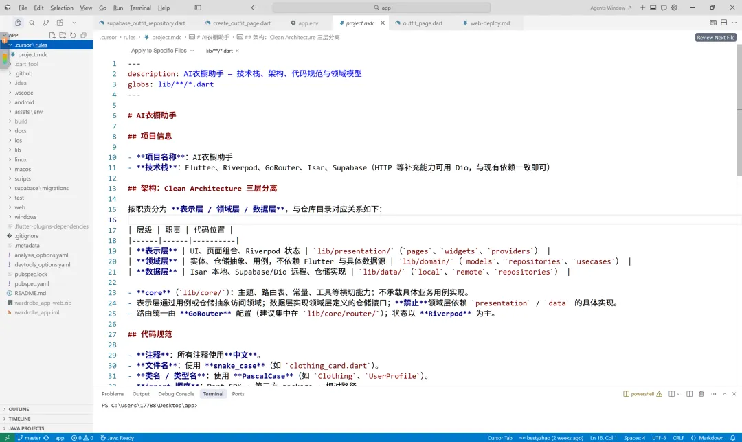---description: AI衣橱助手 — 技术栈、架构、代码规范与领域模型globs: lib/**/*.dart---# AI衣橱助手## 项目信息- **项目名称**:AI衣橱助手- **技术栈**:Flutter、Riverpod、GoRouter、Isar、Supabase(HTTP 等补充能力可用 Dio,与现有依赖一致即可)## 架构:Clean Architecture 三层分离按职责分为 **表示层 / 领域层 / 数据层**,与仓库目录对应关系如下:| 层级 | 职责 | 代码位置 ||------|------|----------|| **表示层** | UI、页面组合、Riverpod 状态 | `lib/presentation/`(`pages`、`widgets`、`providers`) || **领域层** | 实体、仓储抽象、用例,不依赖 Flutter 与具体数据源 | `lib/domain/`(`models`、`repositories`、`usecases`) || **数据层** | Isar 本地、Supabase/Dio 远程、仓储实现 | `lib/data/`(`local`、`remote`、`repositories`) |- **core**(`lib/core/`):主题、路由表、常量、工具等横切能力;不承载具体业务用例实现。- 表示层通过用例或仓储抽象访问领域;数据层实现领域层定义的仓储接口;**禁止**领域层依赖 `presentation` / `data` 的具体实现。- 路由统一由 **GoRouter** 配置(建议集中在 `lib/core/router/`);状态以 **Riverpod** 为主。## 代码规范- **注释**:所有注释使用**中文**。- **文件名**:使用 **snake_case**(如 `clothing_card.dart`)。- **类名 / 类型名**:使用 **PascalCase**(如 `Clothing`、`UserProfile`)。- **import 顺序**:Dart SDK → 第三方 package → 相对路径。- 新增代码放入对应分层目录;复杂逻辑放在 provider / 用例,避免在 Widget 中堆叠数据与业务规则。## 数据模型(领域字段约定)以下字段为产品语义约定;实现时类型(如 `DateTime`、`List<String>`、金额用 `int` 分或 `Decimal` 等)在 `domain/models` 中具体定义,并与 Isar / Supabase 映射保持一致。### Clothing(单品)`id`,`name`,`category`,`colors`,`brand`,`size`,`imageUrl`,`croppedImageUrl`,`tags`,`season`,`occasion`,`style`,`purchaseDate`,`purchasePrice`,`status`,`usageCount`,`lastWornDate`,`notes`### Outfit(搭配)`id`,`name`,`clothingIds`,`scene`,`occasion`,`season`,`imageUrl`,`wornDates`,`plannedDates`,`notes`,`isShared`### UserProfile(用户档案)`styles`,`bodyType`,`height`,`weight`,`favoriteColors`,`favoriteOccasions`