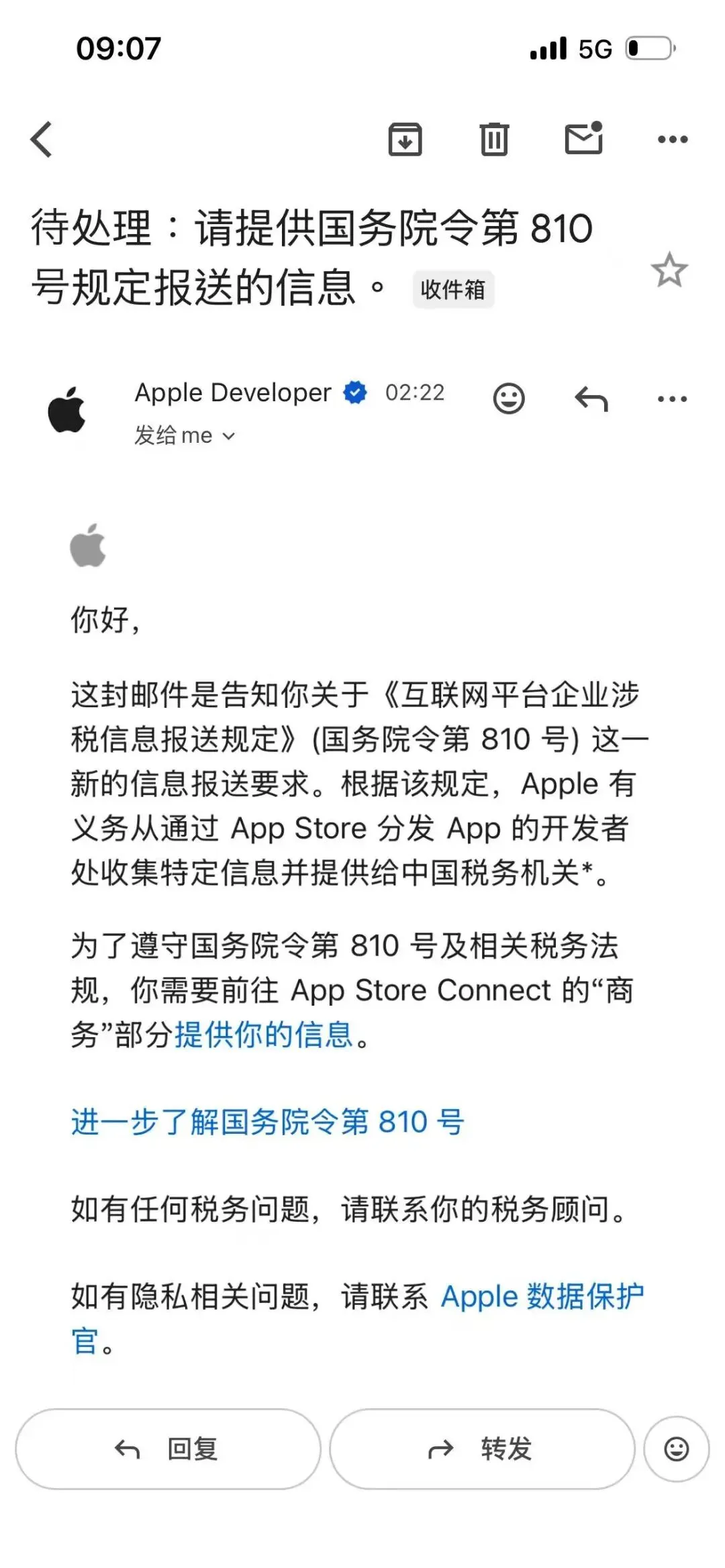 凌晨两点多,Apple 的一封邮件直接把我惊醒:「请提供国务院令第 810 号规定报送的信息」。打开 App Store Connect 后台,黄色警告条和弹窗里的红框提示,瞬间把我拉回了刚入行时面对合规问题的慌乱 —— 原来不止我一个人被这突如其来的税务合规要求打了个措手不及。