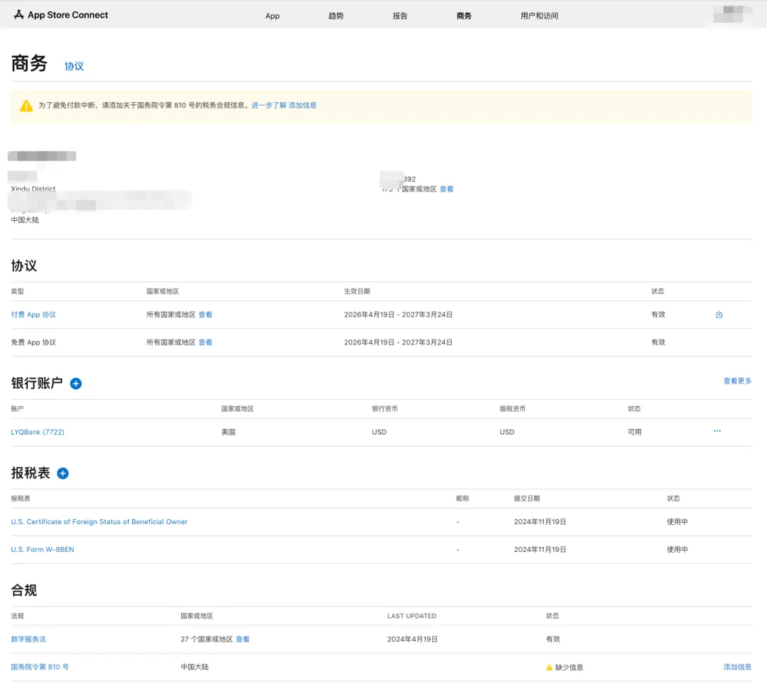 打开 App Store Connect 的「商务」页面,就能看到醒目的黄色警告条,以及合规模块里状态为 “缺少信息” 的「国务院令第 810 号」。点击「添加信息」,跟着这两步走就行: