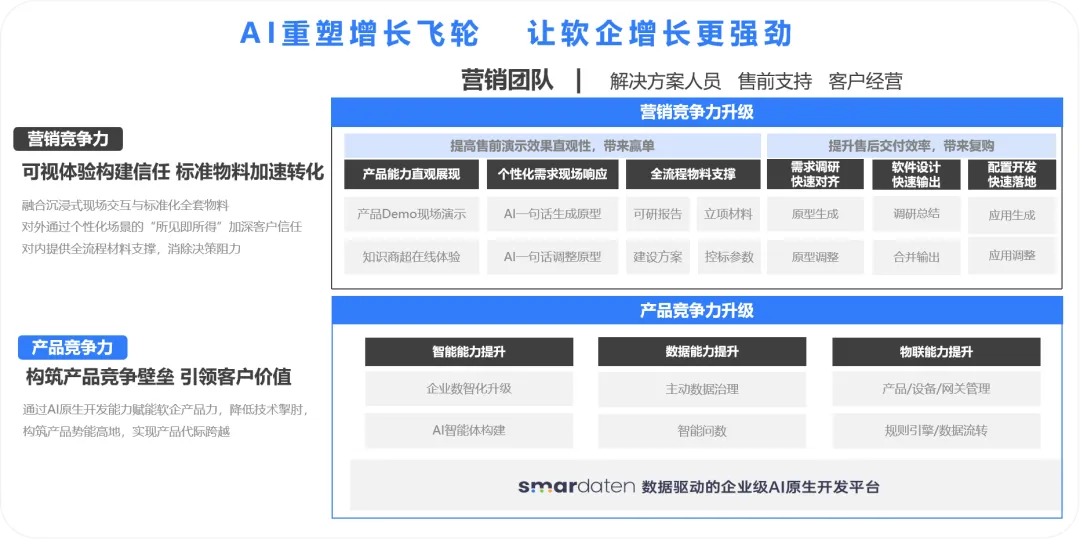 总体而言,数睿数据提供了一套组合拳,以“高质量赢单”、“高质量增长”作为解局的突破点。将AI原生开发平台、营销赋能、交付体系三者深度融合,聚焦“高质量赢单增长”的核心目标,全方位解决软件企业的核心痛点。