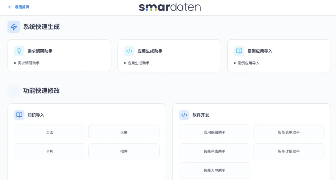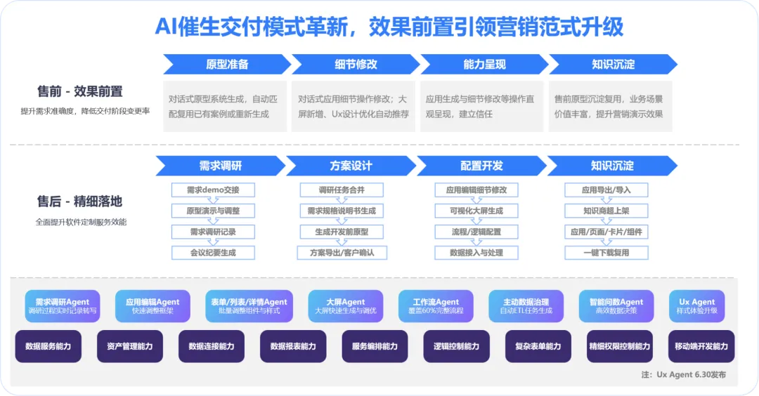 高质量交付:依托过往项目资源快速复用,结合 AI 辅助需求调研与原型快速开发,通过标准化交付体系高效完成应用交付,为后续复购与口碑传播奠定基础。
