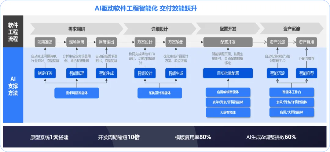 售后交付环节依托智能软件工程体系,实现全流程的高效落地。借助需求调研Agent实时记录转写会议内容,自动生成需求规格说明书与开发前原型;应用编辑Agent、大屏Agent、工作流Agent等协同作业,快速调整框架、生成表单列表、覆盖60%以上标准流程。配合主动数据治理、智能问数等能力,开发周期缩短30%,同时保证高质量交付。应用、页面、组件等可一键导出复用并上架知识库,形成持续沉淀的资产体系。
