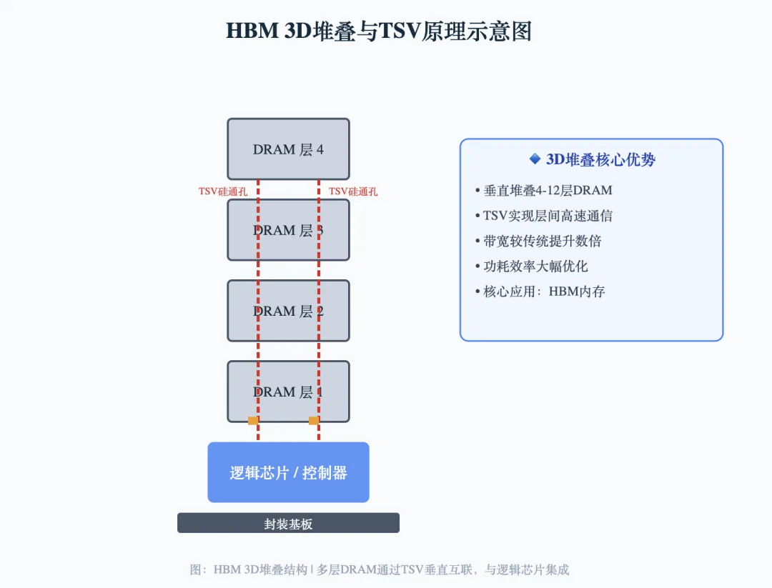 HBM做的就是垂直堆叠——把4层、8层甚至12层DRAM芯片像叠千层饼一样垒起来,中间通过TSV(硅通孔)打洞穿通,让数据在垂直方向高速穿梭。
