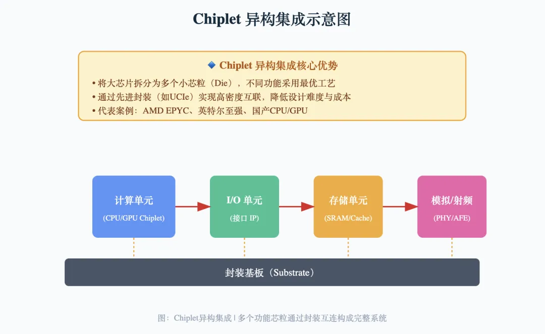 这两股力量一推,行业公认的解决方案就是异构集成——把多个不同工艺的芯片”拼”在一个封装里,用先进封装技术让它们协同工作。