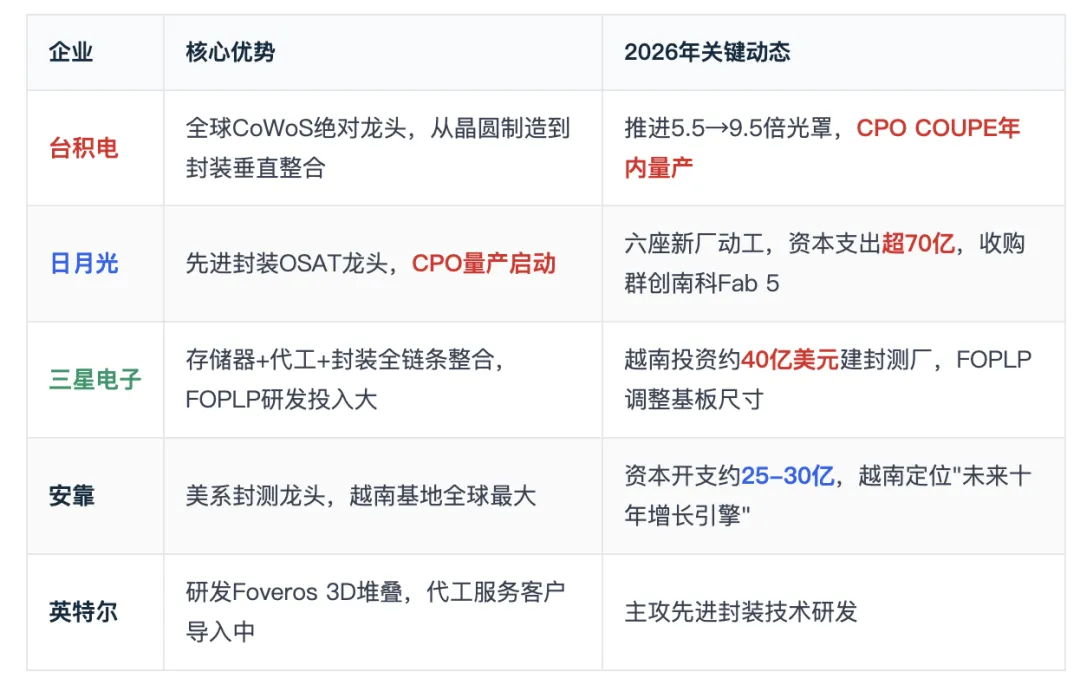 台积电、三星、英特尔在”后道环节”持续加码,反映出全球半导体产业的价值链正在从前段晶圆制造向后段封装迁移。