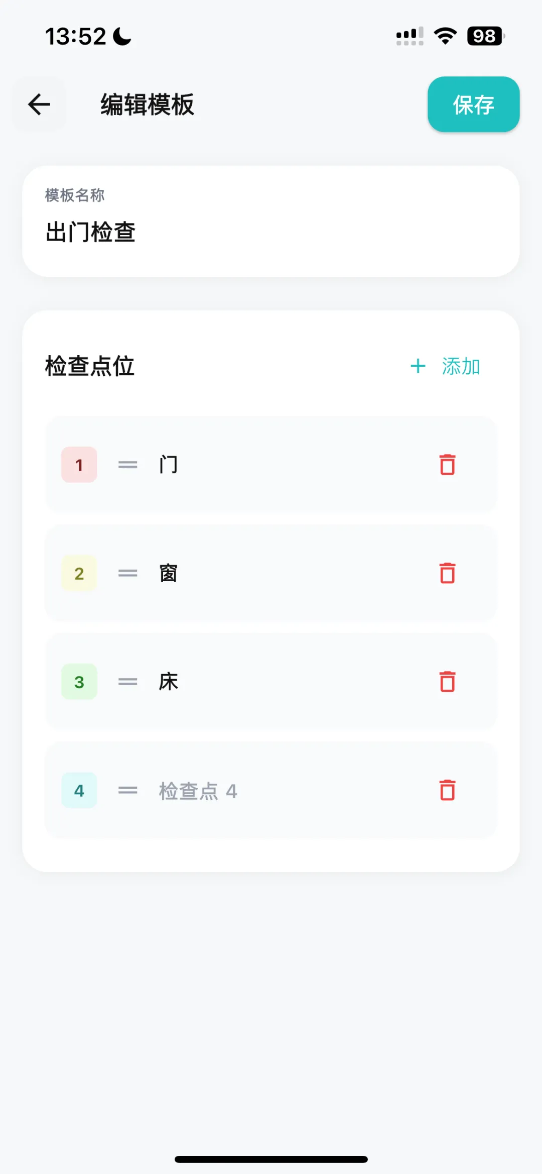 我给自己建了个模板叫【晚安检查】,按我的行走路线排序: