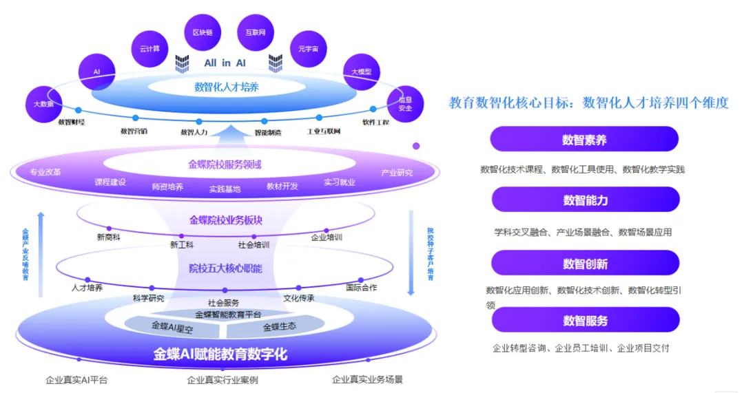 金蝶教育以“All in AI”战略为引领,依托金蝶AI赋能教育数字化平台,通过真实的工业软件、真实的企业实践案例、真实的企业业务场景,构建产教融合新生态。