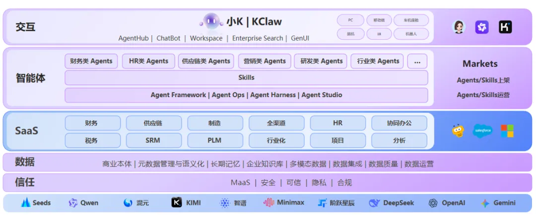 金蝶企业管理AI以“小K ”为核心交互入口,构建“交互-智能体-SaaS-数据-信任”五层架构的企业级AI平台。平台提供Agent开发、应用开发、集成连接、数据智能分析四大核心套件,支持工业软件的设计与开发。提供工业企业的财务、供应链、制造、采购、营销、人力等核心应用,支持基于企业的真实场景的学习实践。