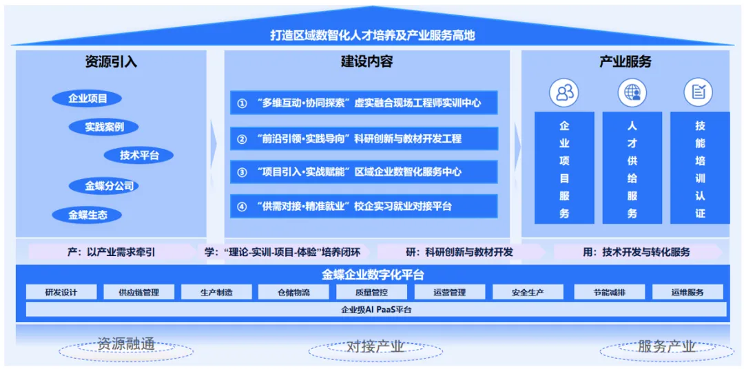 依托金蝶在企业云服务、AI+管理、智能制造等领域的核心优势,创新打造“产业发展-人才培养-赋能应用“的产教协同发展范式,将企业数字化转型实践融入高校科研创新与人才培养,将行业应用场景引入专业教学,推进教育、科技、人才协同融合发展,为产业数字化升级培育兼具数字素养与产业实践能力的高素质人才。