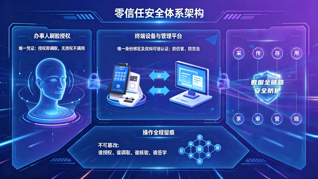 保护数据安全是重中之重。系统采用零信任架构,构建“1+1+8”安全体系:以办事人刷脸授权为唯“1”凭证,严格执行授权即调取,无授权不调用;终端设备与管理平台的唯“1”身份绑定及双向可信认证,防仿冒、防攻击;同时,覆盖数据“采、传、存、用、享、审、管、毁”8重安全能力,融合动态令牌、全链路加密追踪、密钥生命周期管理等前沿技术。操作全程留痕、不可篡改,做到“谁授权、谁调取、谁核验、谁签字”,记录可查,在最大化保障公民隐私与数据安全的同时,也为窗口工作人员提供了“尽职免责”依据,化解改革后顾之忧。